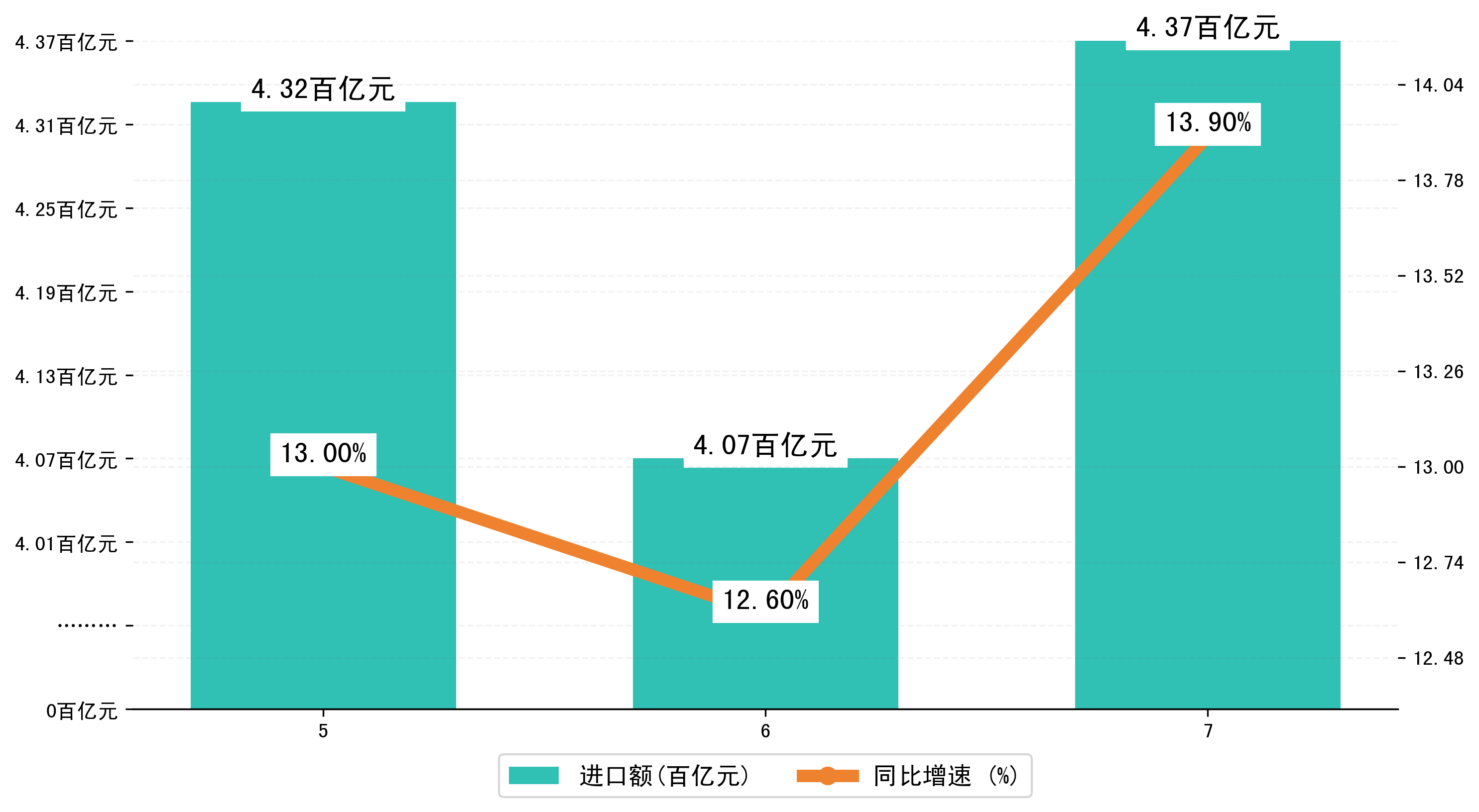 以人民币计,2024年7月东莞市进口额为436,7573.3839万元,相比上月增加了29,7859.2614万元;相比上年同期增加了75,9858.5633万元,同比增加了13.90%。