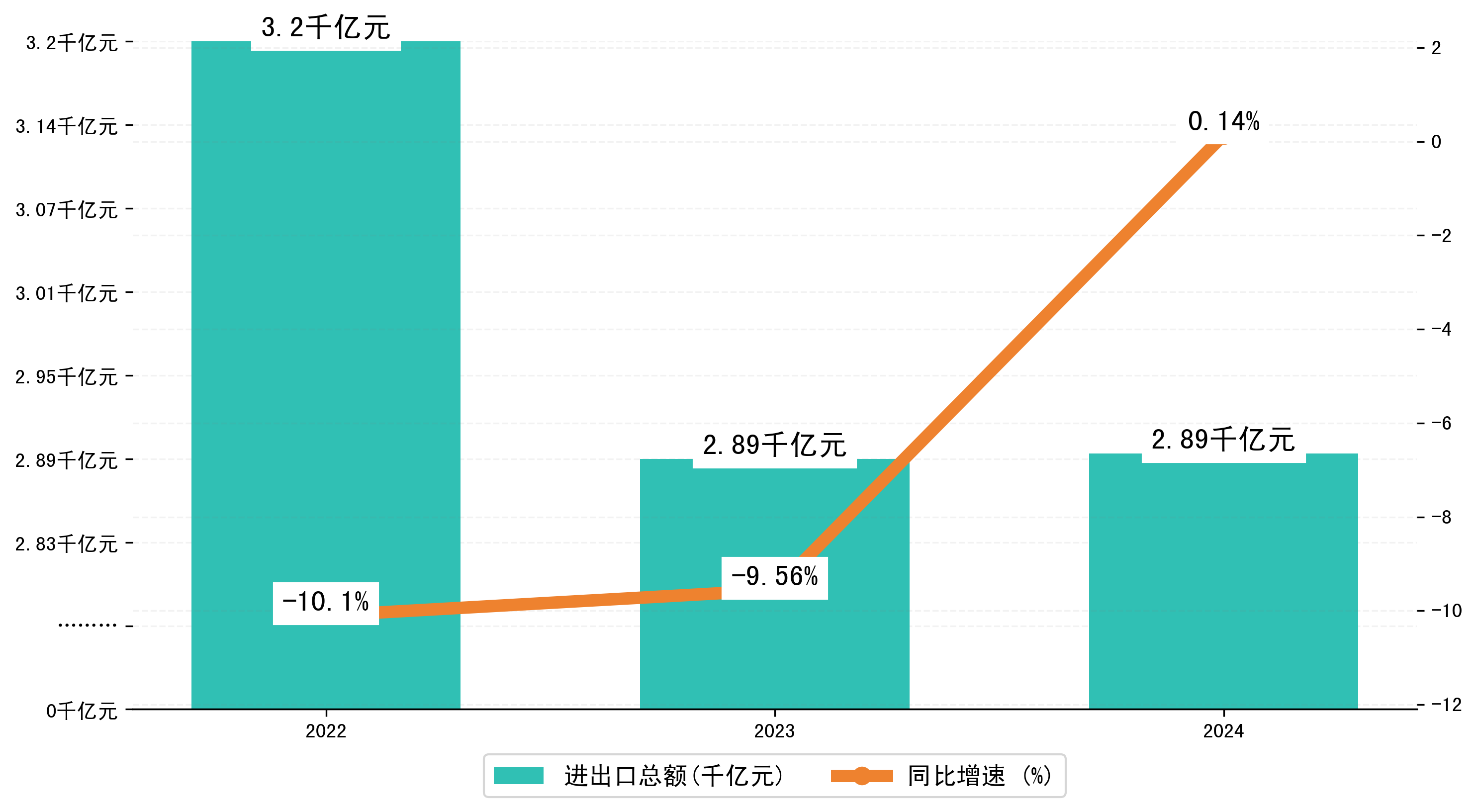 以美元计,2024年1-3月东莞市进出口总额为406,9643.037万美元,相比上年同期增加了14,0476.8785万美元,同比增加-2.80%。