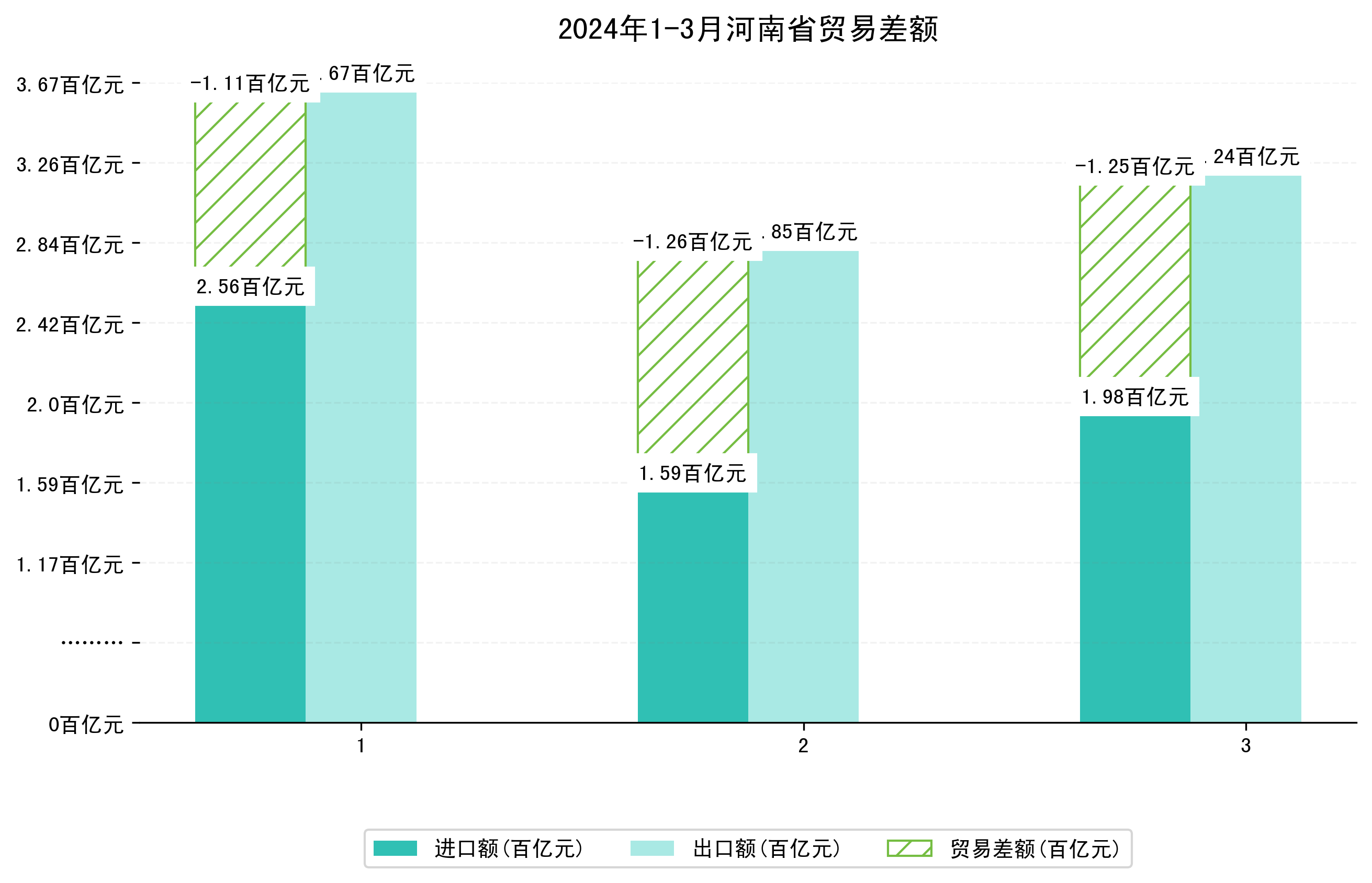 以人民币计,2024年1-3月河南省贸易差额为362,9051,2693万元(贸易顺差),相比上年同期减少了350,5473,6785万元,同比减少-49.13%。