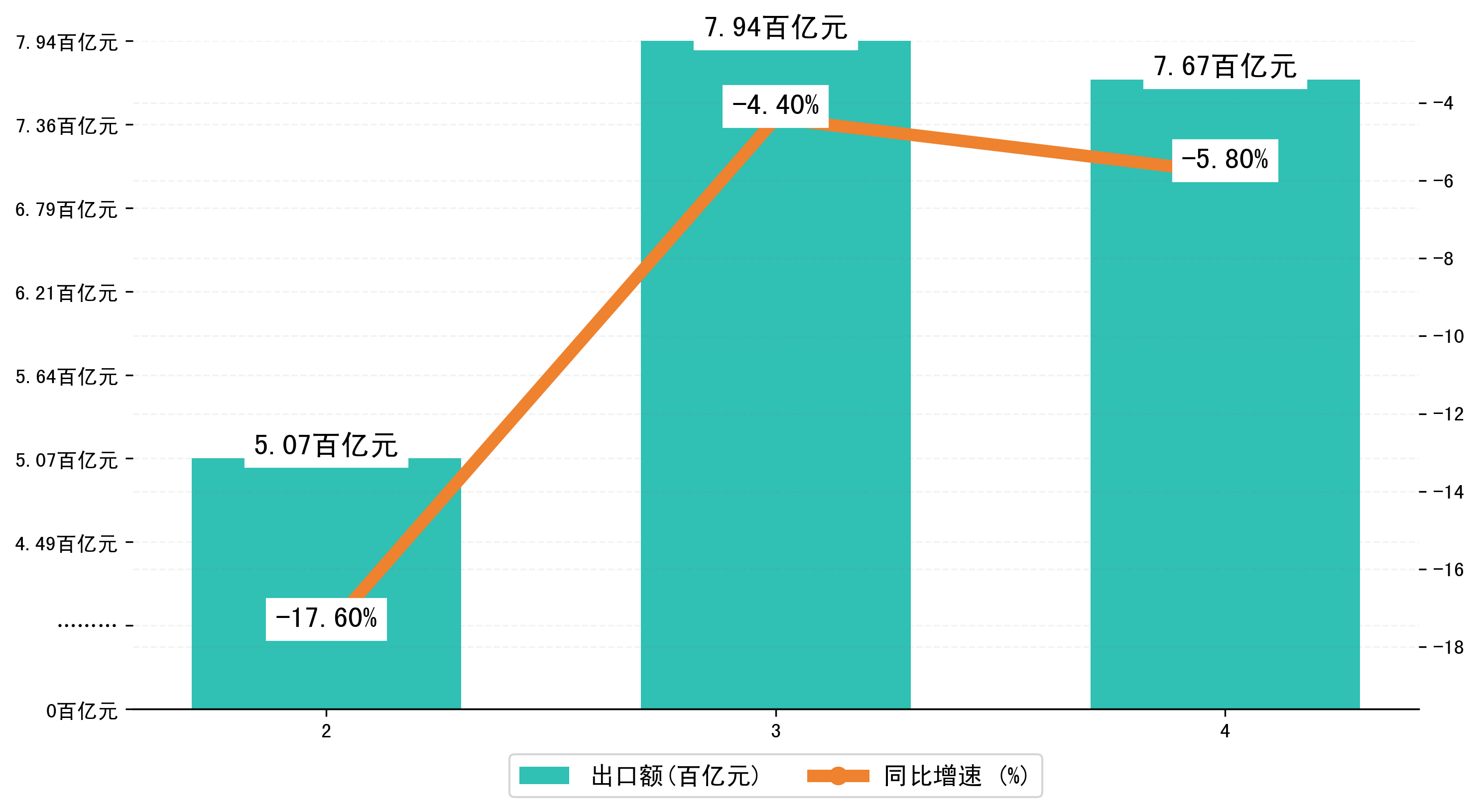 以美元计,2023年4月东莞市出口额为111,7440.6552万美元,相比上月减少了4,5122.3119万美元;相比上年同期减少了20,8608.3772万美元,同比减少-12.60%。