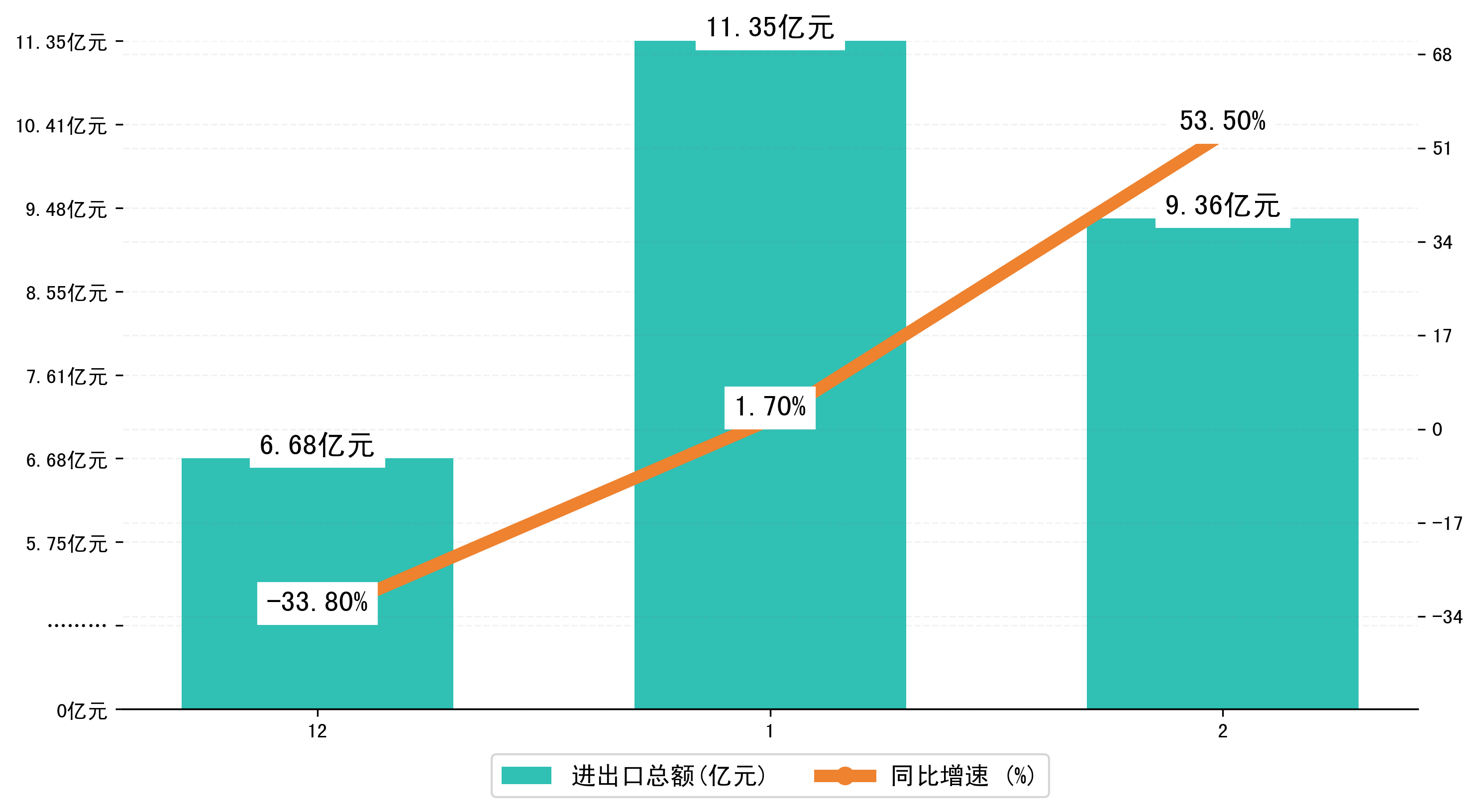 以美元计,2023年1-2月二连浩特市进出口总额为2,9832.7354万美元,相比上年同期增加了1,2245.186万美元,同比增加41.10%。