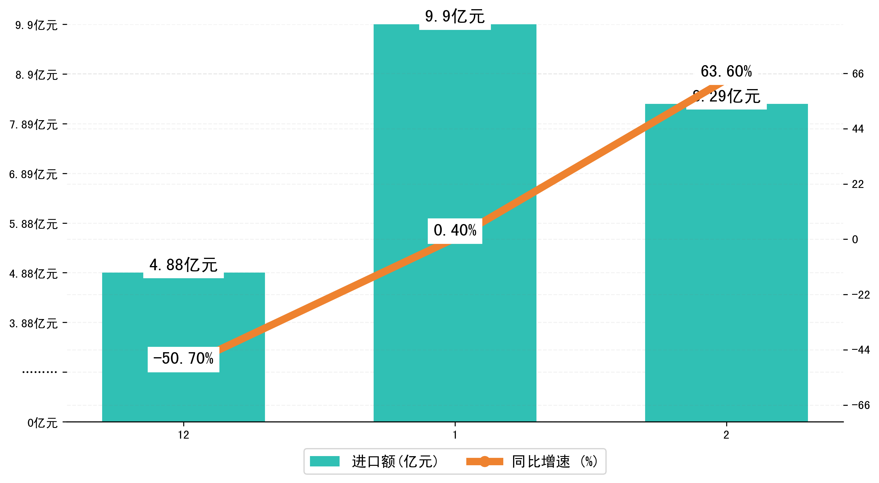 以美元计,2023年1-2月二连浩特市进口额为2,6178.461万美元,相比上年同期增加了1,2312.0607万美元,同比增加50.30%。