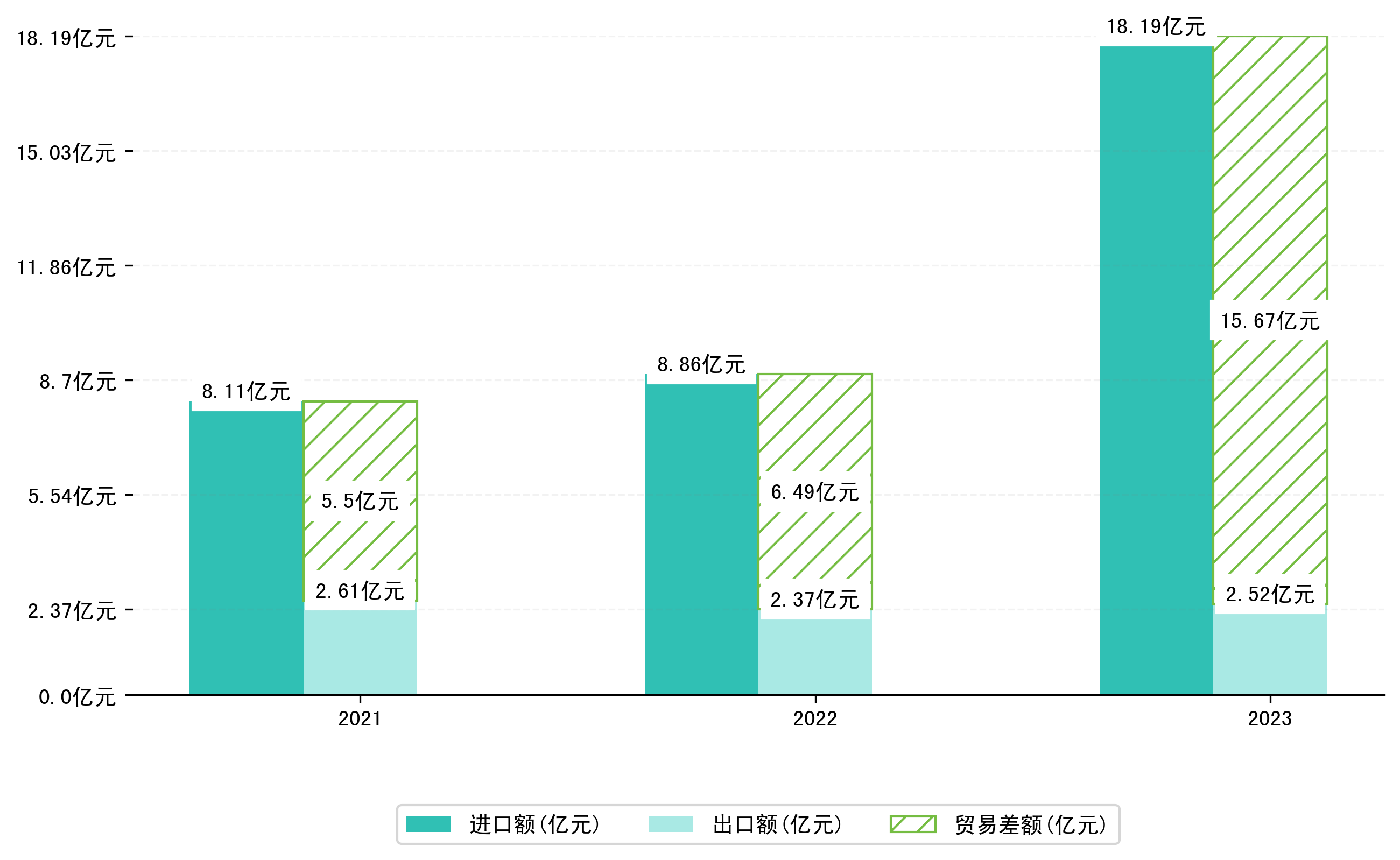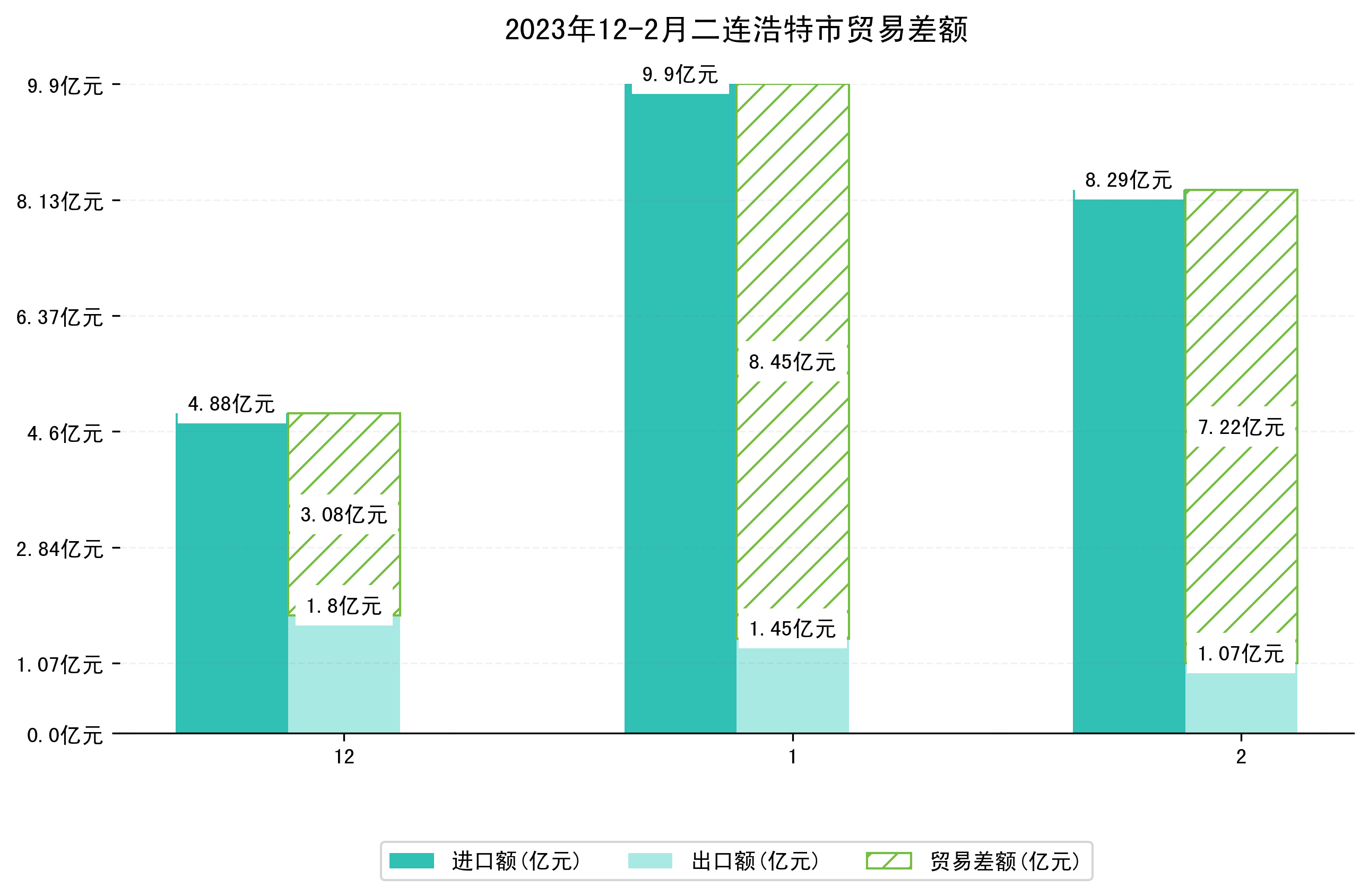以美元计,2023年1-2月二连浩特市贸易差额为2,2524,1866万美元(贸易逆差),相比上年同期减少了1,2378,9354万美元,同比减少122.02%。
