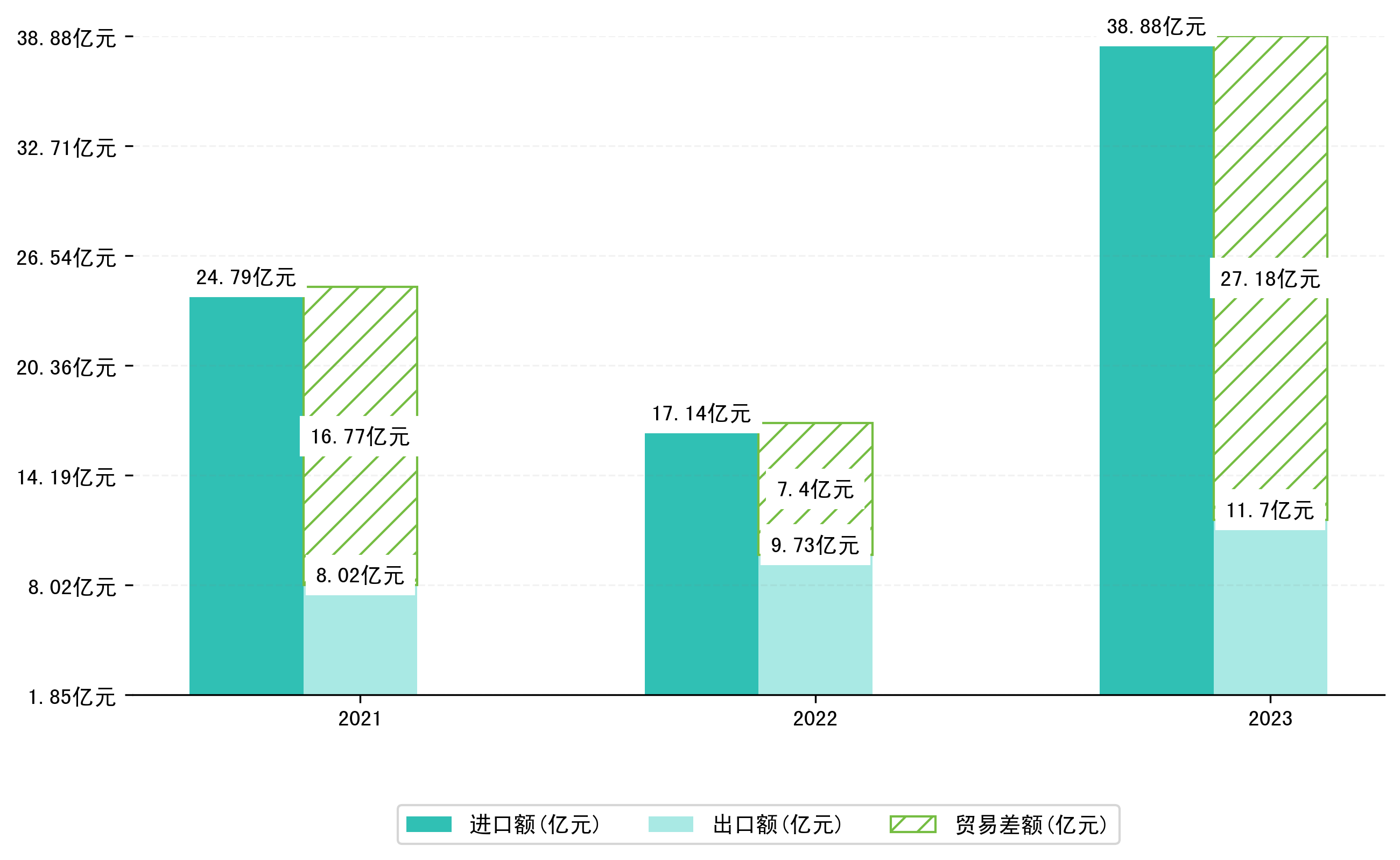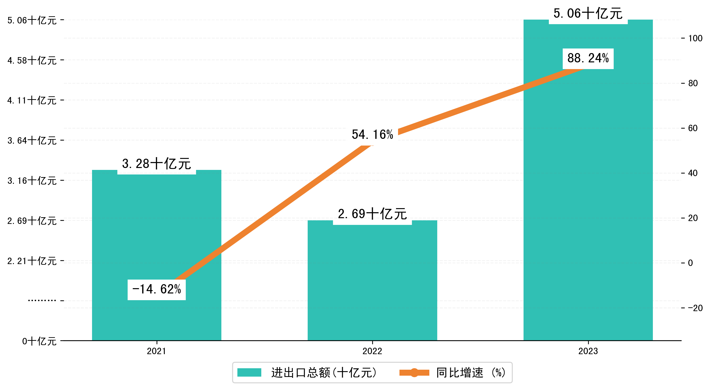 以美元计,2023年1-5月二连浩特市进出口总额为7,3432.5万美元,相比上年同期增加了3,1411.3313万美元,同比增加74.80%。