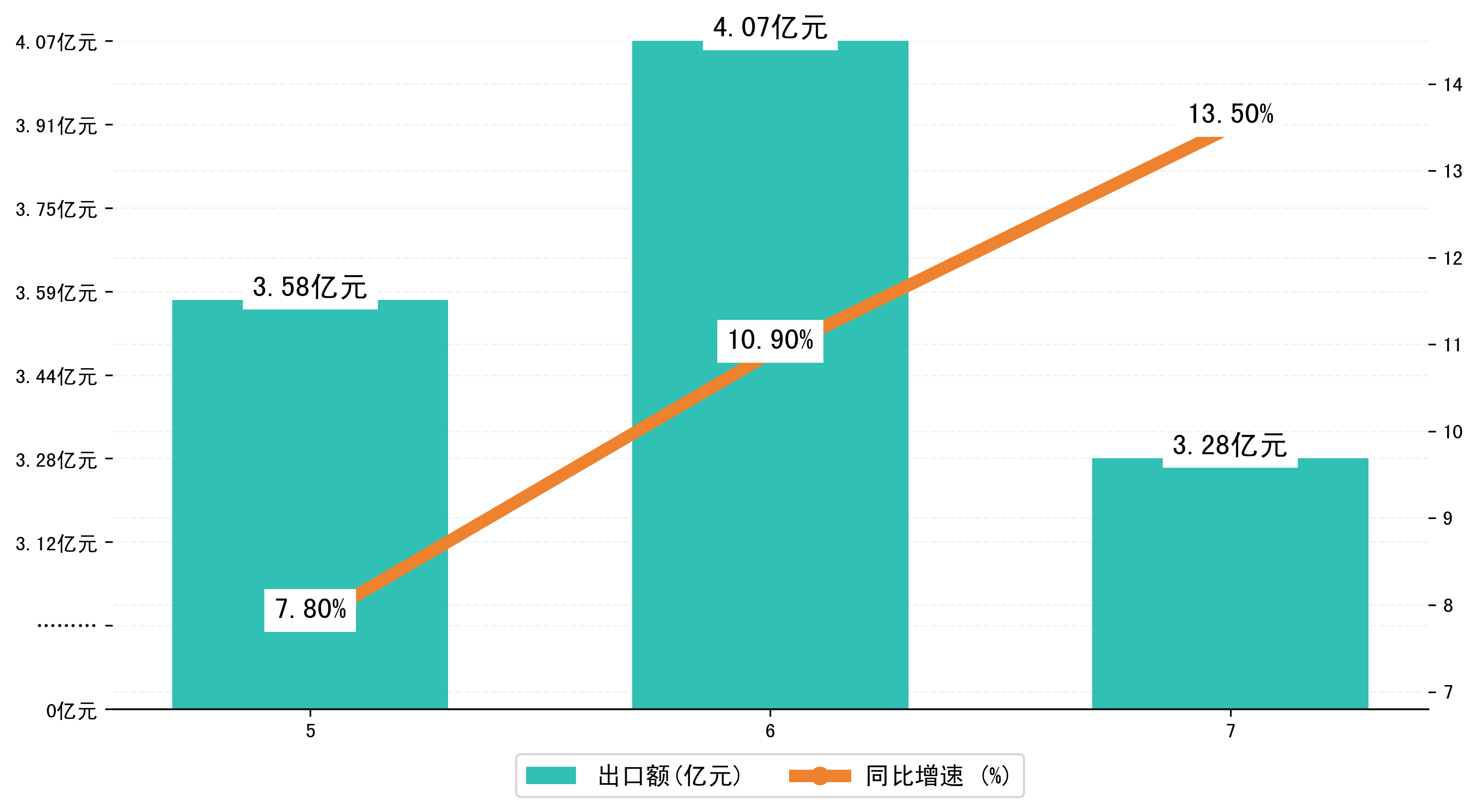 以人民币计,2024年1-7月二连浩特市出口额为19,9602.5054万元,相比上年同期增加了2,2655.7297万元,同比增加了13.50%。