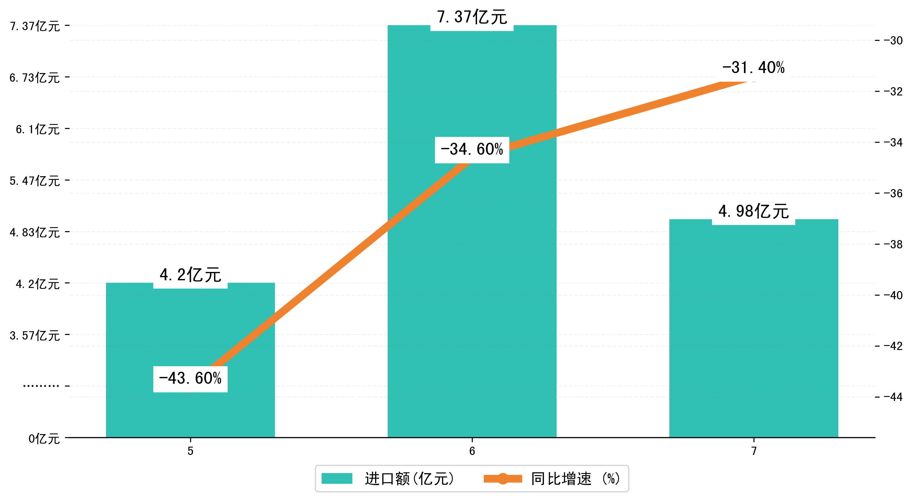 以人民币计,2024年1-7月二连浩特市进口额为34,3442.7229万元,相比上年同期减少了15,6810.2176万元,同比减少了-31.40%。
