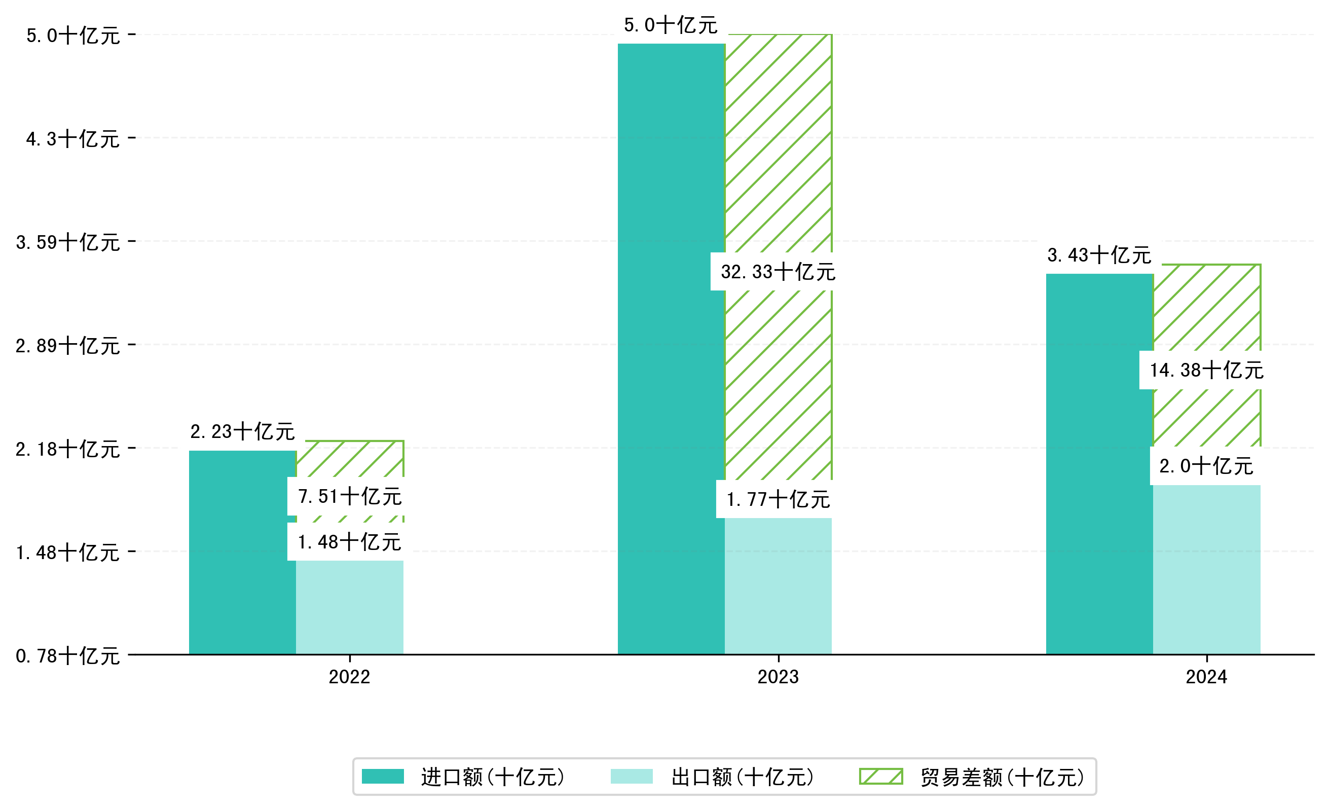 以人民币计,2024年7月二连浩特市贸易差额为1,7015,8722万元(贸易逆差),相比上月增加了1,5960,0038万元,即2254,8591万美元;相比上年同期增加了8180,3470万元,同比增加-32.47%。