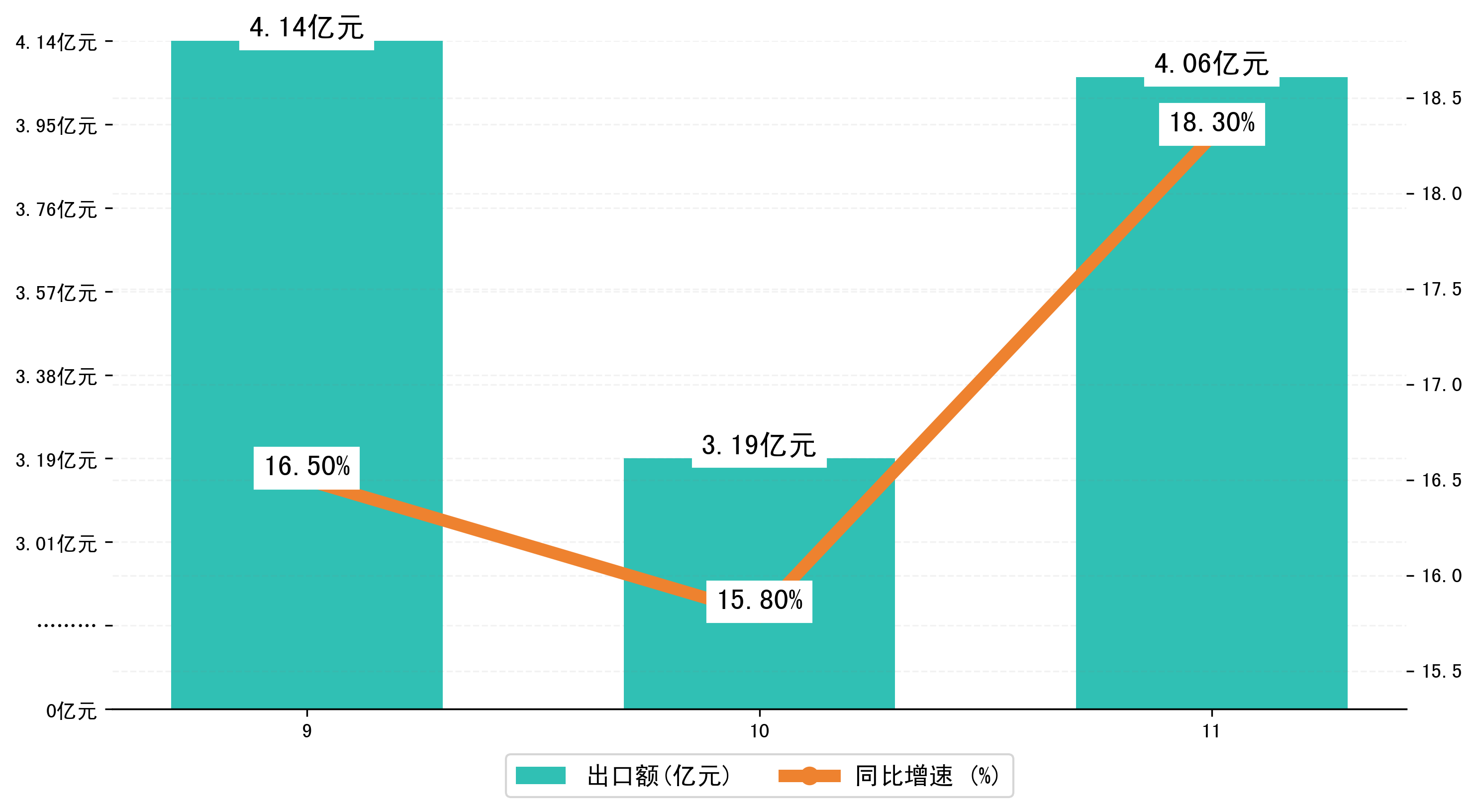 以人民币计,2024年1-11月二连浩特市出口额为36,1742.5318万元,相比上年同期增加了5,4582.2626万元,同比增加了18.30%。