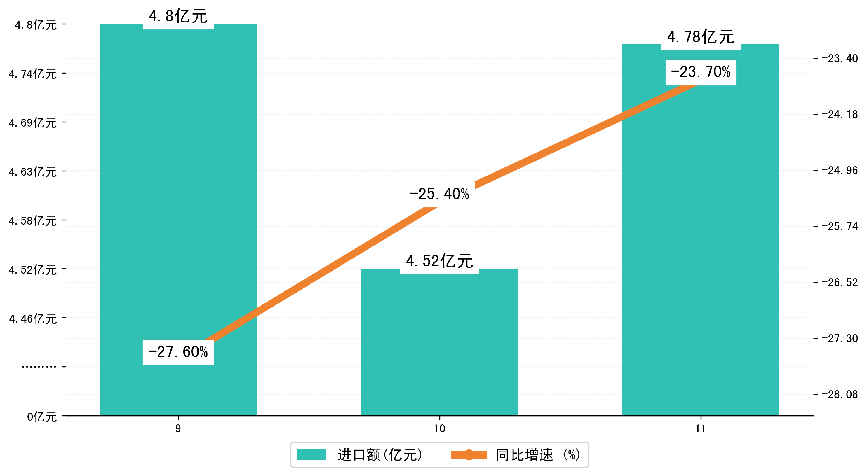 以美元计,2024年1-11月二连浩特市进口额为7,4744.6567万美元,相比上年同期减少了2,4780.3618万美元,同比减少-24.90%。