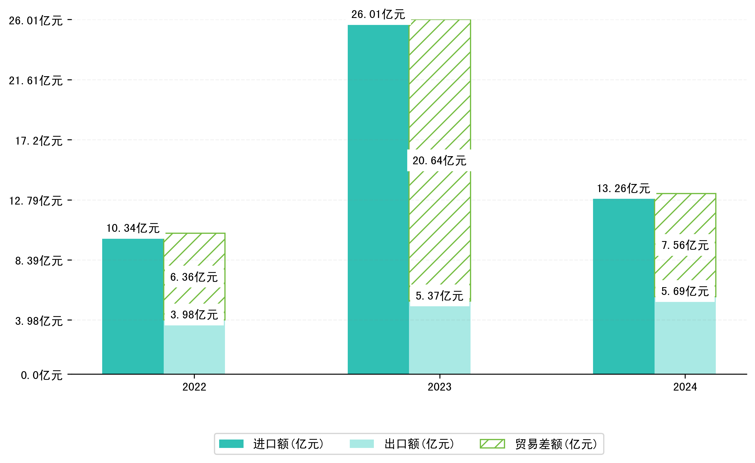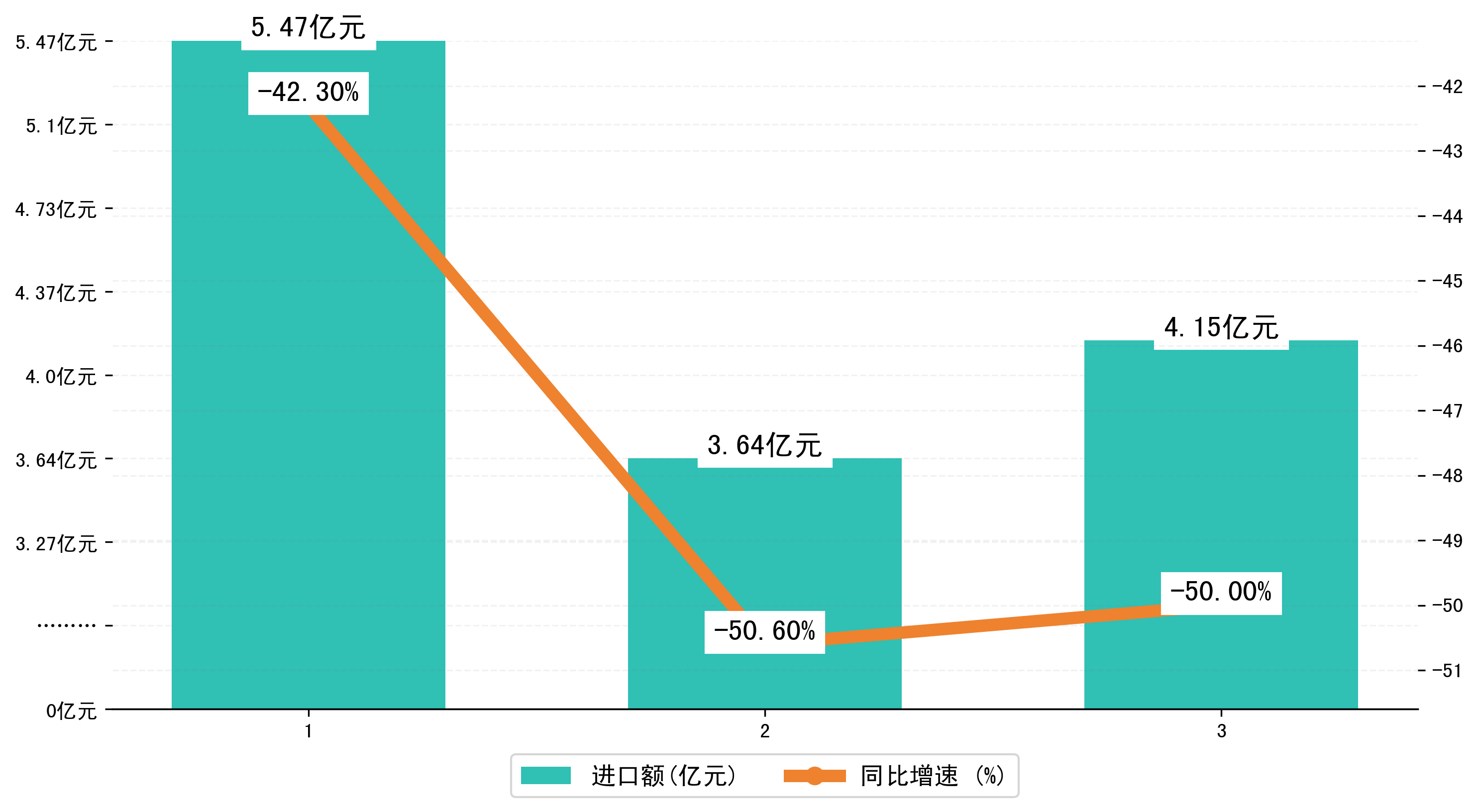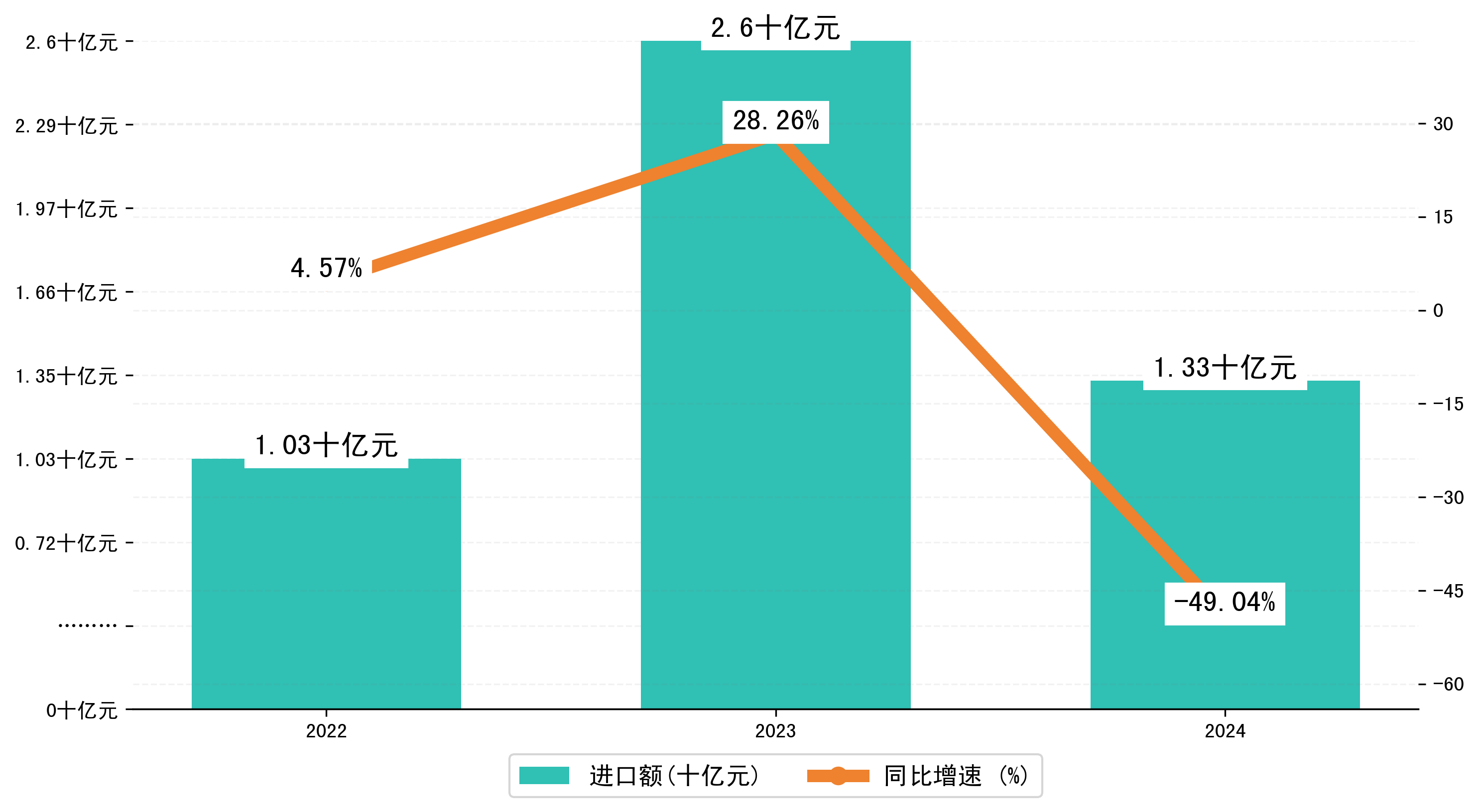 以美元计,2024年1-3月二连浩特市进口额为1,8648.6484万美元,相比上年同期减少了1,8915.6282万美元,同比减少-51.60%。