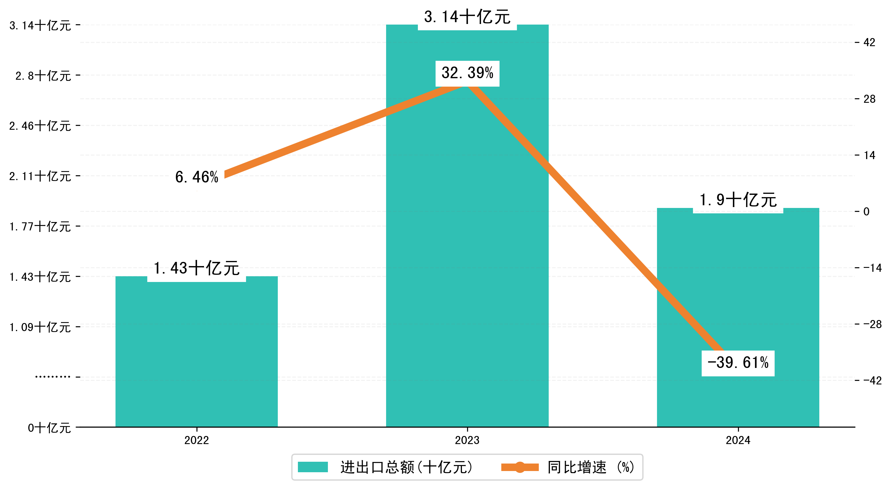 以人民币计,2024年1-3月二连浩特市进出口总额为18,9527.2924万元,相比上年同期减少了12,4319.727万元,同比减少了-40.60%。