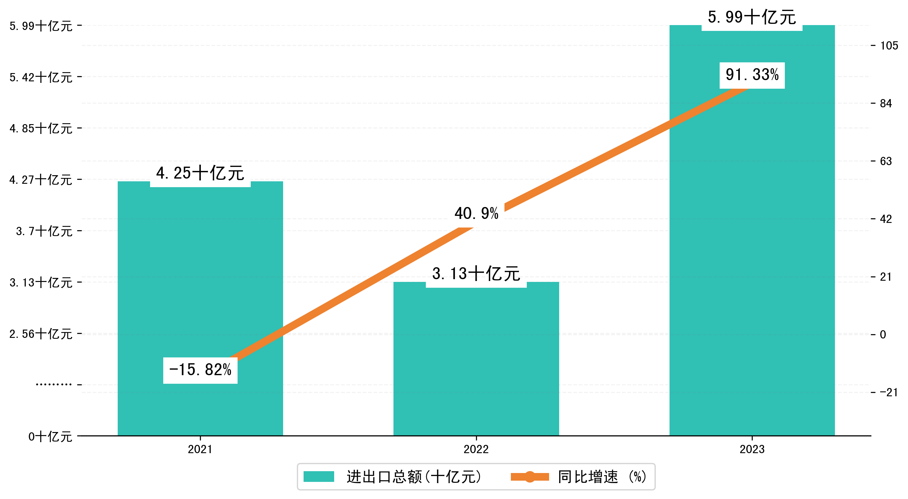 以人民币计,2023年1-6月二连浩特市进出口总额为59,9035.0666万元,相比上年同期增加了28,5938.8407万元,同比增加了91.30%。