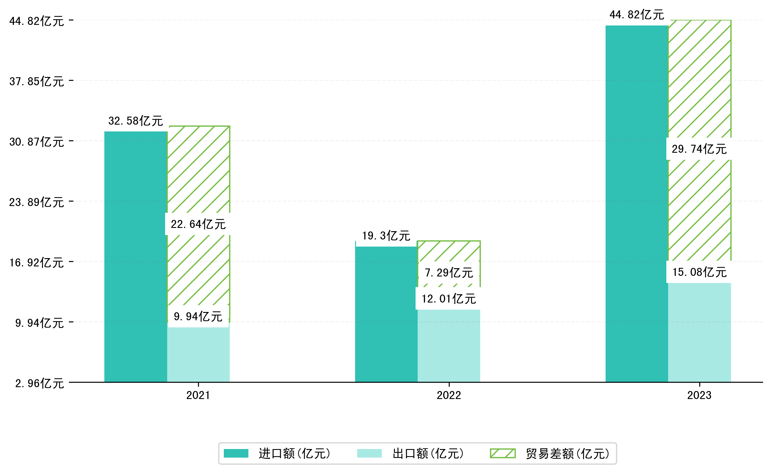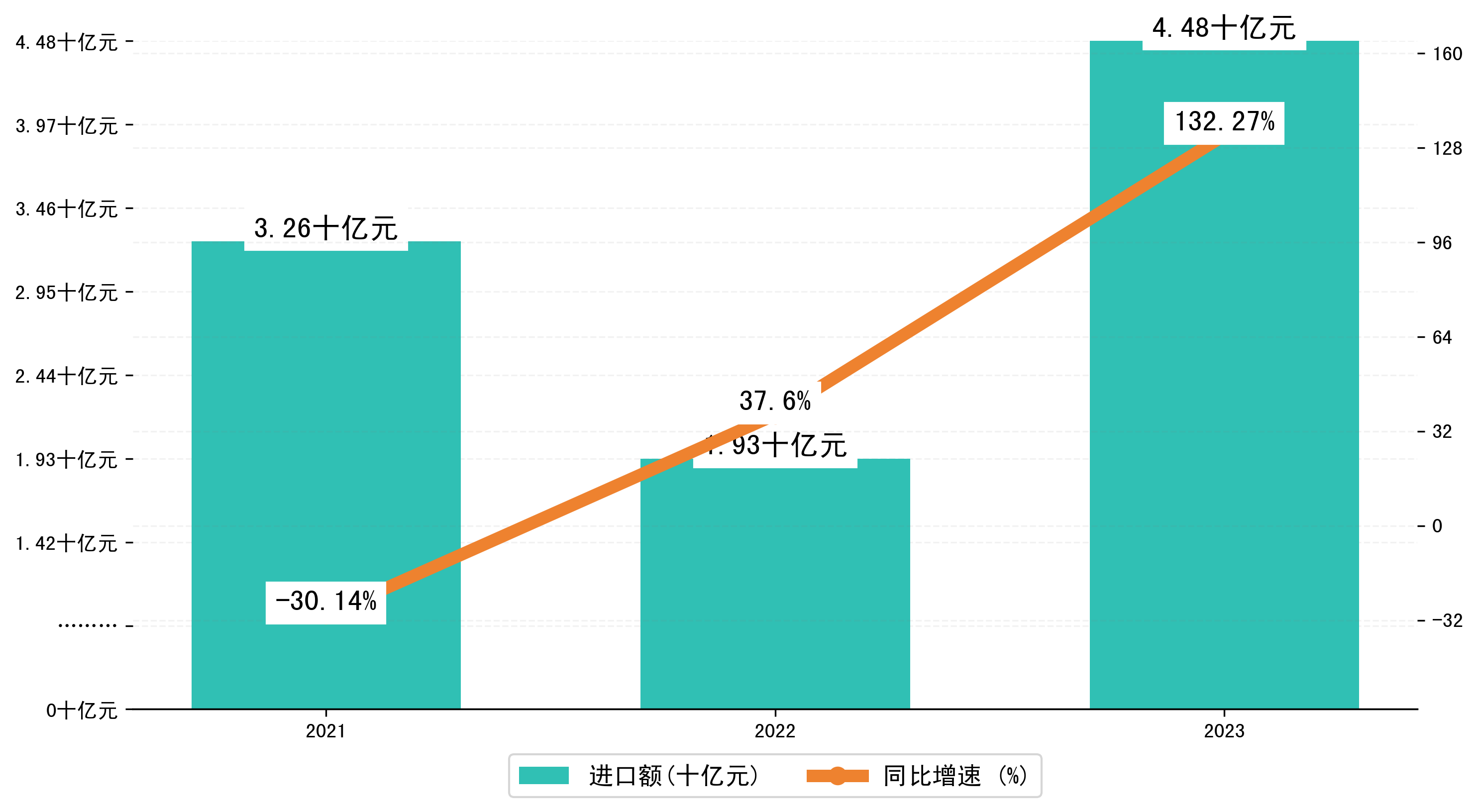 以人民币计,2023年1-6月二连浩特市进口额为44,8235.4103万元,相比上年同期增加了25,5253.6054万元,同比增加了132.30%。