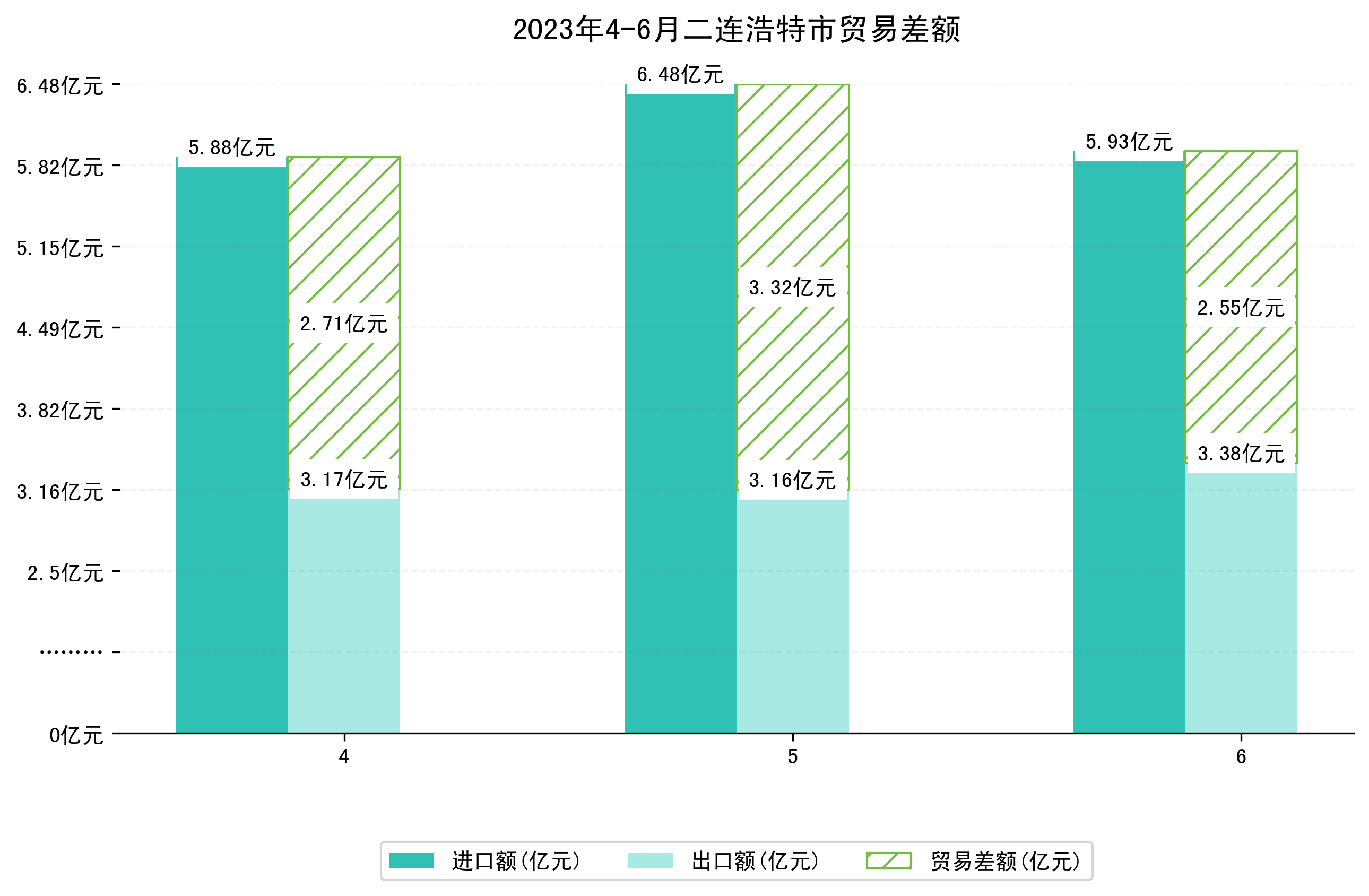 以美元计,2023年1-6月二连浩特市贸易差额为4,3264,5030万美元(贸易逆差),相比上年同期减少了3,1735,6744万美元,同比减少275.27%。