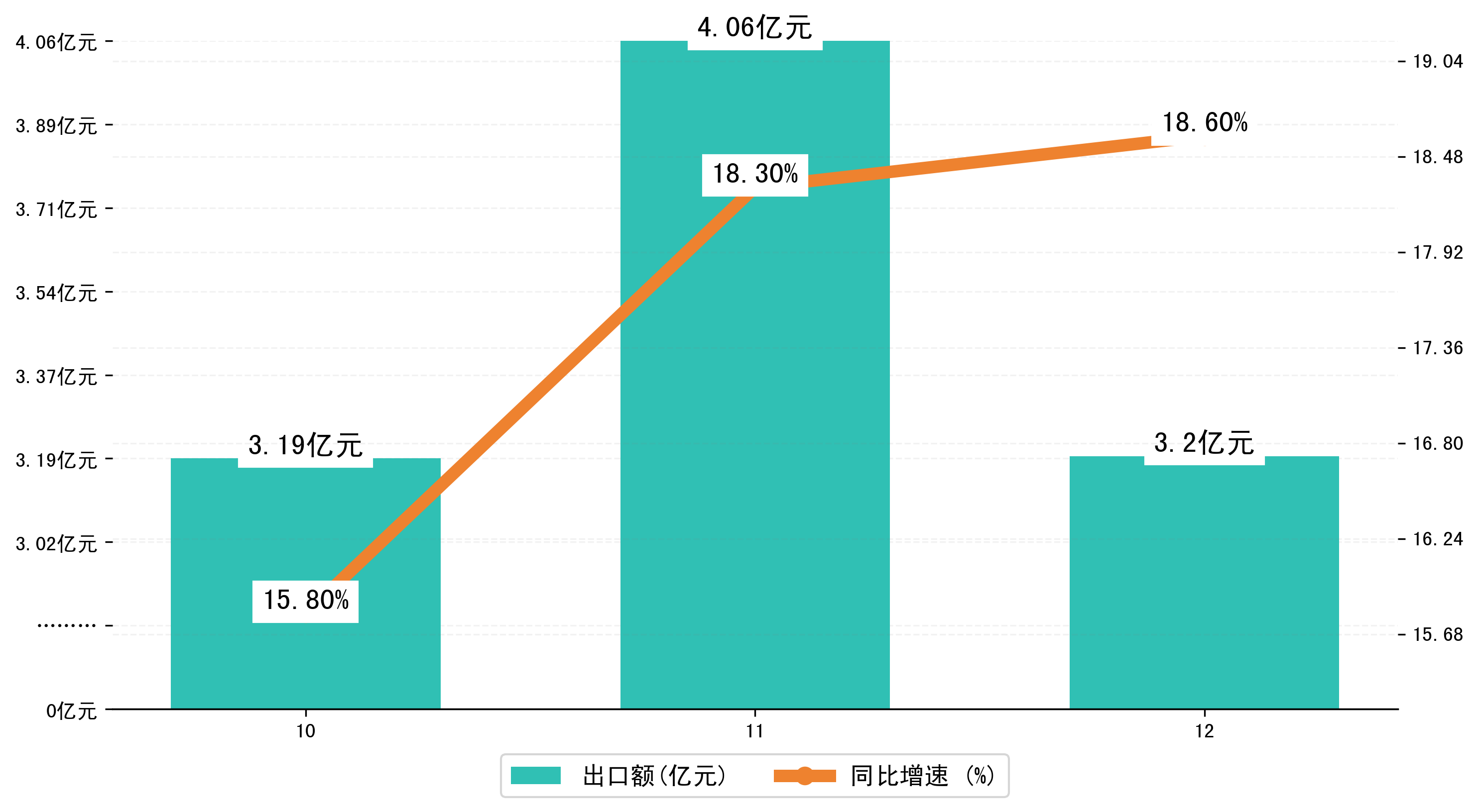 以人民币计,2024年1-12月二连浩特市出口额为39,3742.0045万元,相比上年同期增加了6,0597.8854万元,同比增加了18.60%。