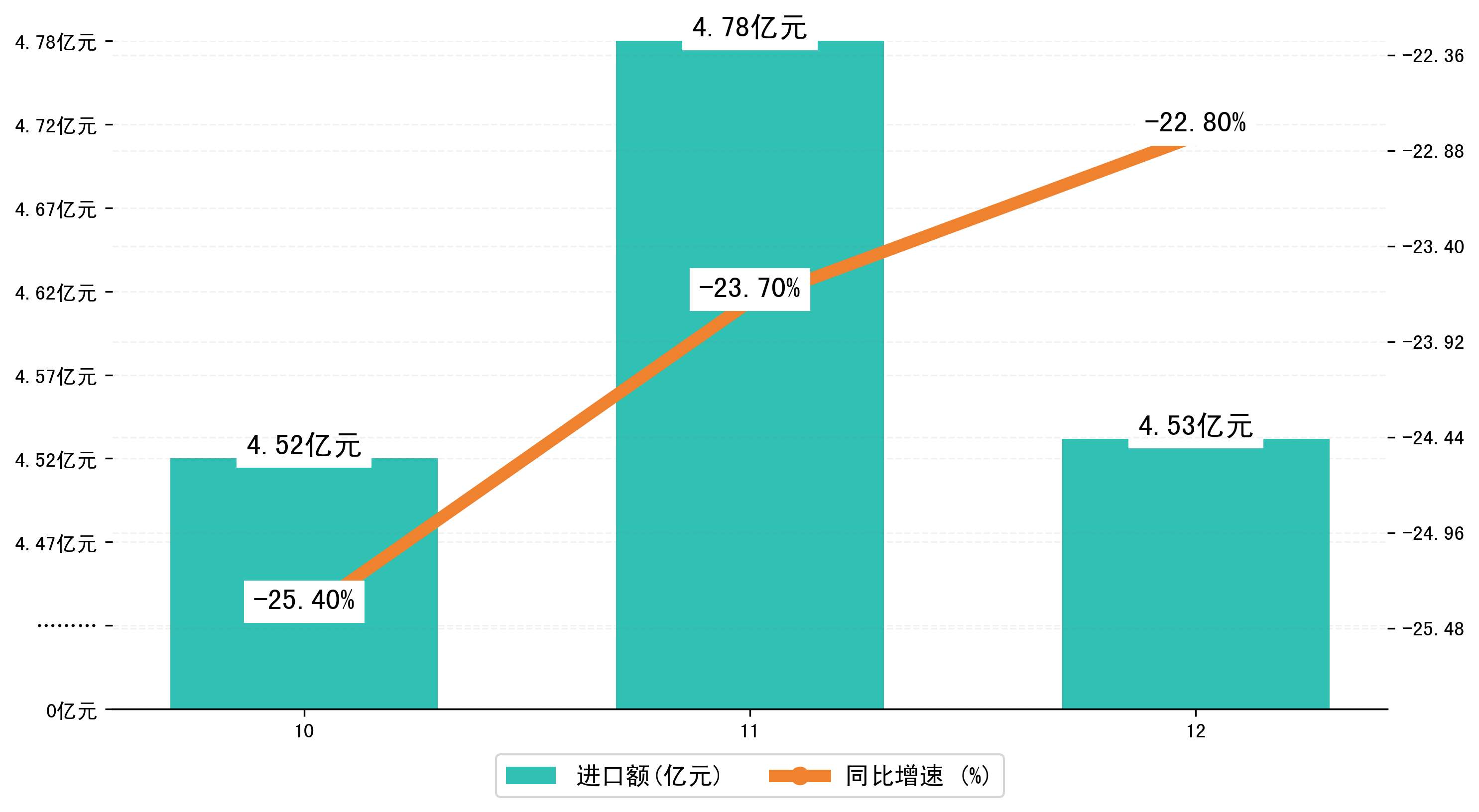 以人民币计,2024年1-12月二连浩特市进口额为57,6367.88万元,相比上年同期减少了17,0057.5819万元,同比减少了-22.80%。