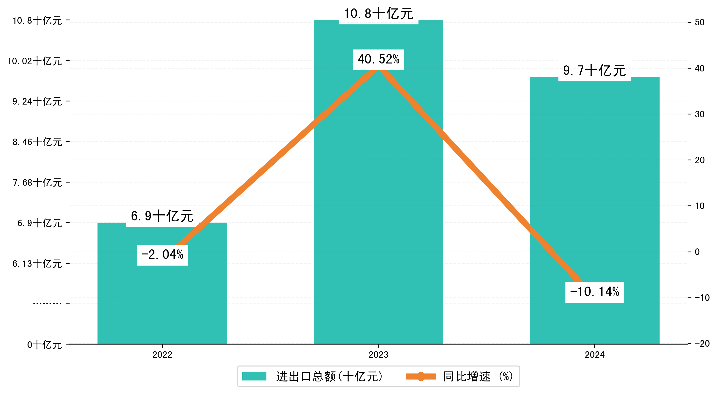 以人民币计,2024年1-12月二连浩特市进出口总额为97,0109.8845万元,相比上年同期减少了10,9459.6965万元,同比减少了-10.00%。
