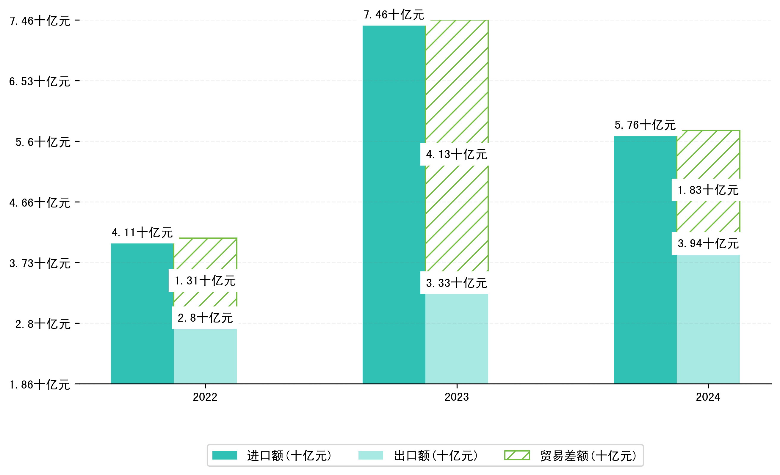 以美元计,2024年1-12月二连浩特市贸易差额为2,5680,2553万美元(贸易逆差),相比上年同期增加了3,3740,3830万美元,同比增加-56.78%。