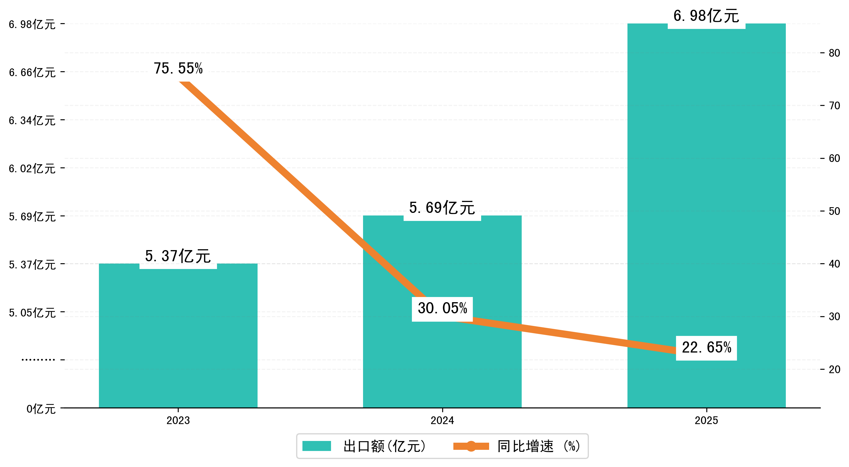 以人民币计,2025年1-3月二连浩特市出口额为6,9846.4927万元,相比上年同期增加了1,2897.3766万元,同比增加了22.60%。