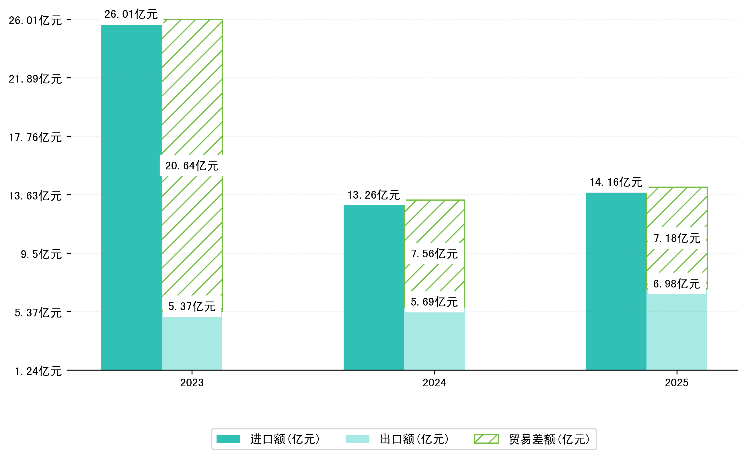以美元计,2025年3月二连浩特市贸易差额为3741,8798万美元(贸易逆差),相比上月减少了1536,9426万美元;相比上年同期减少了906,6305万美元,同比减少31.98%。