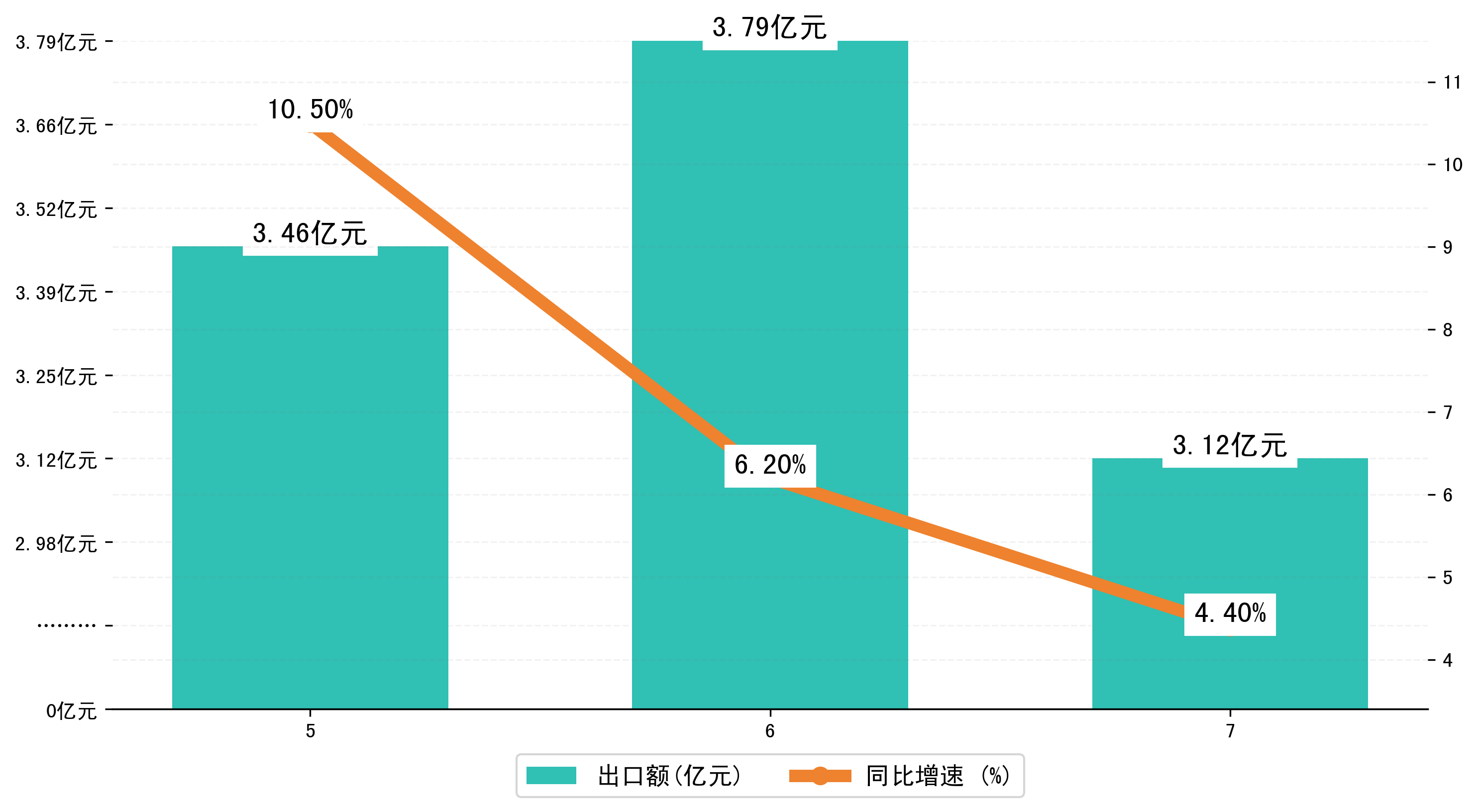 以美元计,2025年1-7月二连浩特市出口额为2,9019.1601万美元,相比上年同期增加了926.3199万美元,同比增加3.30%。