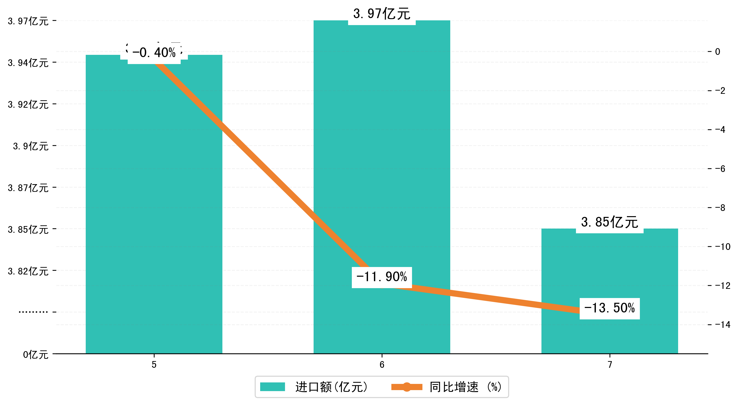 以人民币计,2025年7月二连浩特市进口额为3,8479.6006万元,相比上月减少了1204.1977万元;相比上年同期减少了1,1320.8512万元,同比减少了-13.50%。