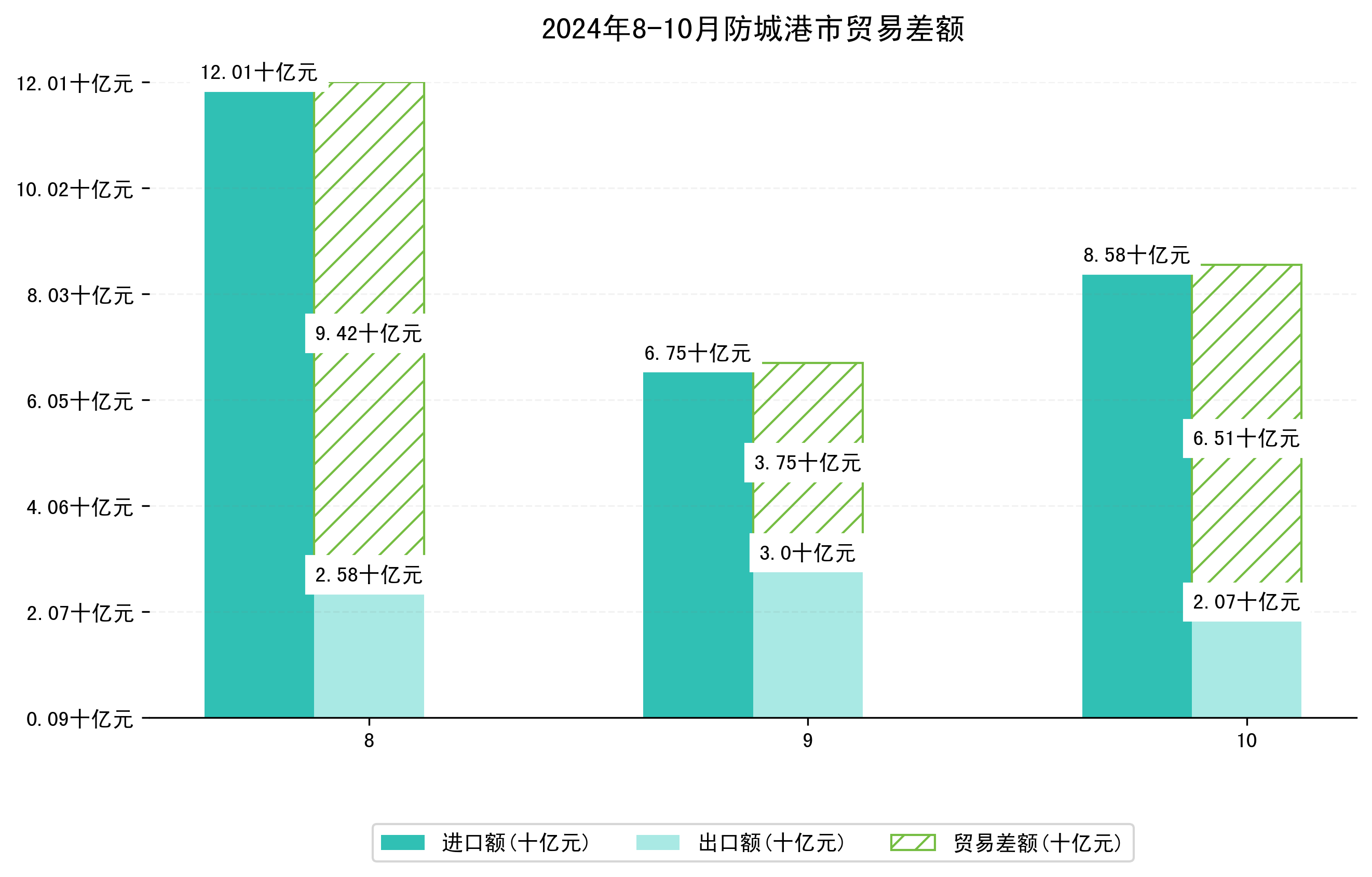 以人民币计,2024年1-10月防城港市贸易差额为618,7023,2539万元(贸易逆差),相比上年同期增加了52,8941,8401万元,同比增加-7.88%。