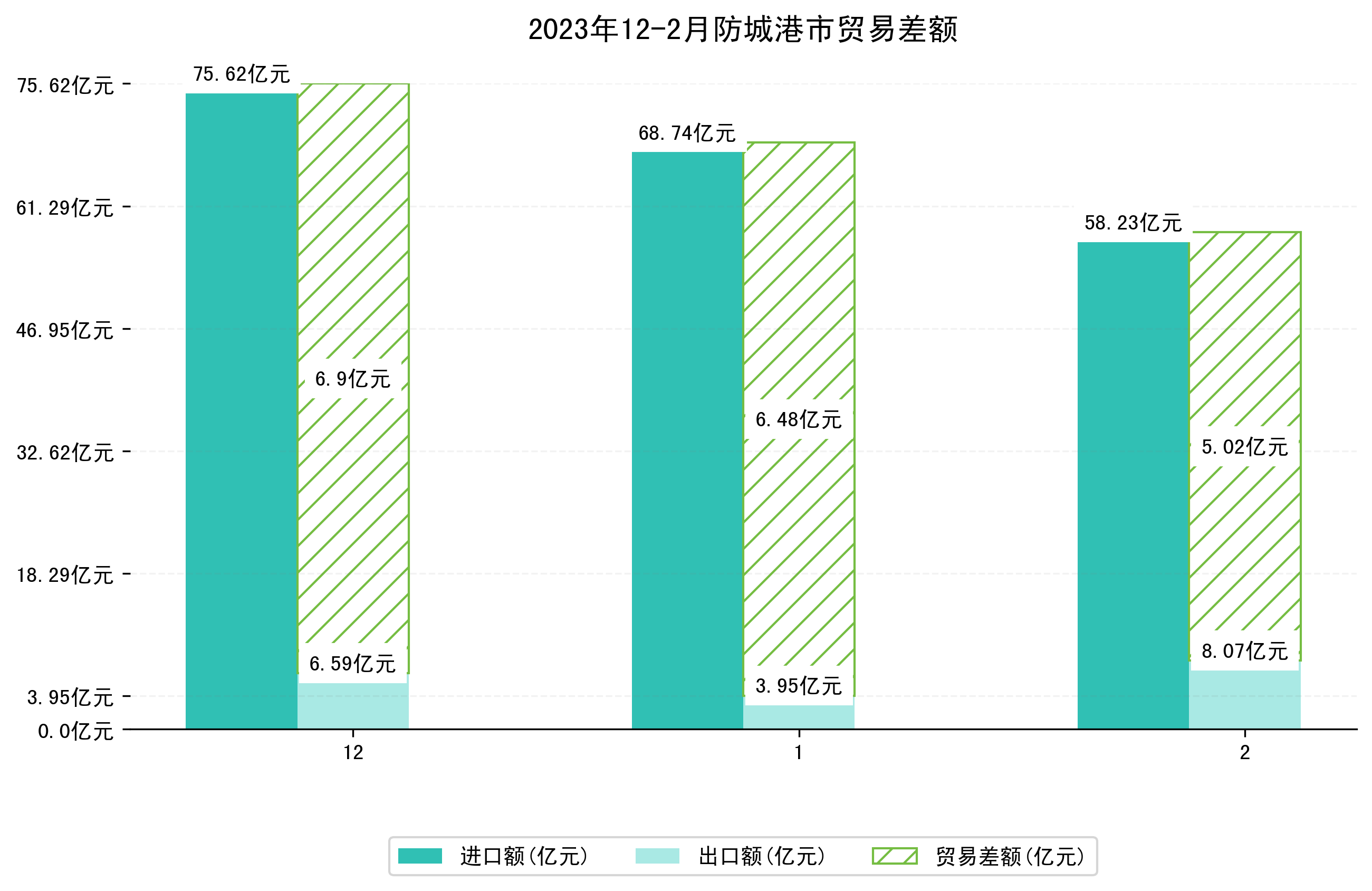 以美元计,2023年1-2月防城港市贸易差额为16,6486,4909万美元(贸易逆差),相比上年同期减少了7323,8478万美元,同比减少4.6%。