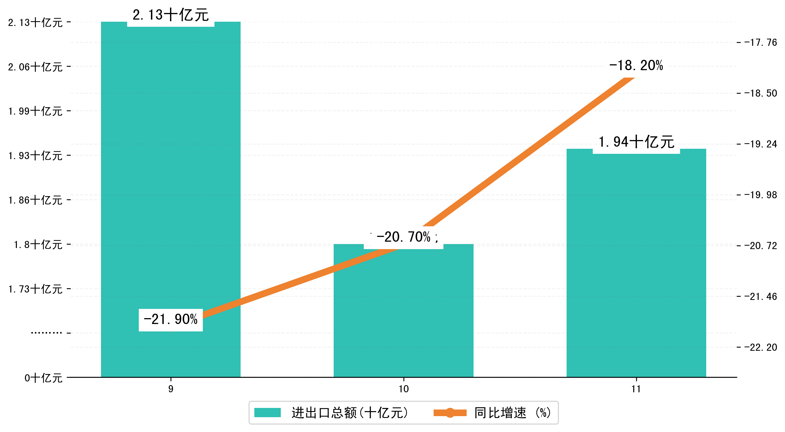 以人民币计,2023年11月阳江市进出口总额为19,3686.9934万元,相比上月增加了1,4094.3086万元;相比上年同期增加了2,8110.0495万元,同比减少了-18.20%。