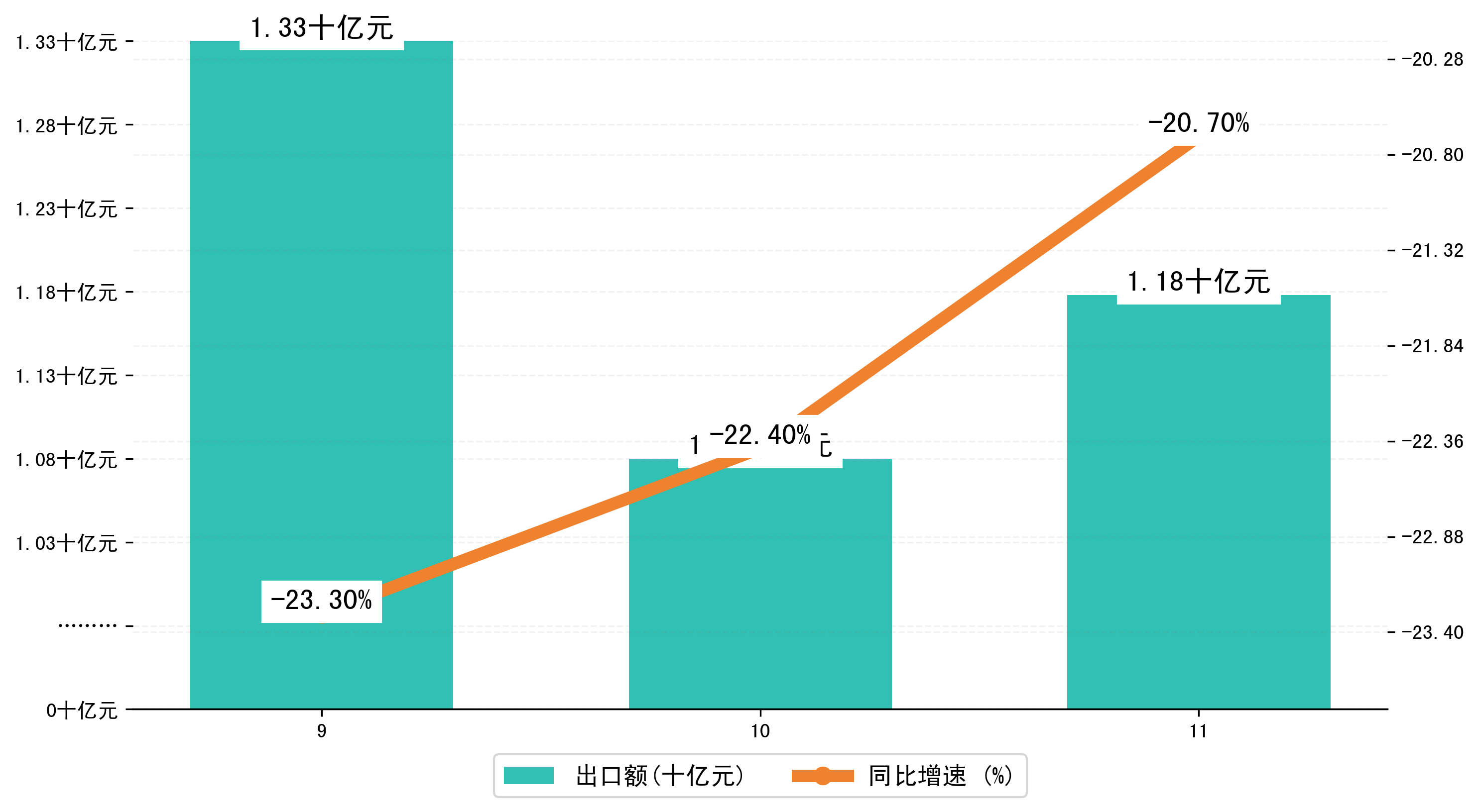 以美元计,2023年1-11月阳江市出口额为18,7267.6434万美元,相比上年同期减少了6,5396.9937万美元,同比减少-25.60%。