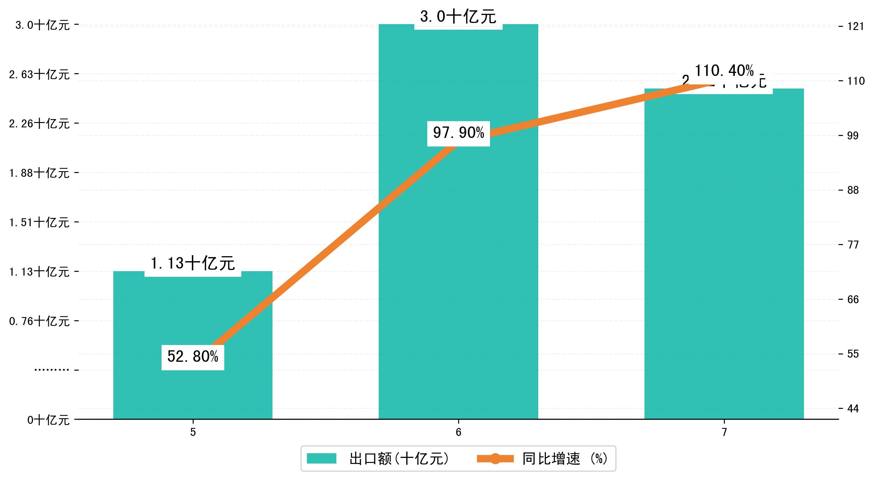 以人民币计,2024年1-7月防城港市出口额为102,3377.7855万元,相比上年同期增加了53,7352.0827万元,同比增加了110.40%。