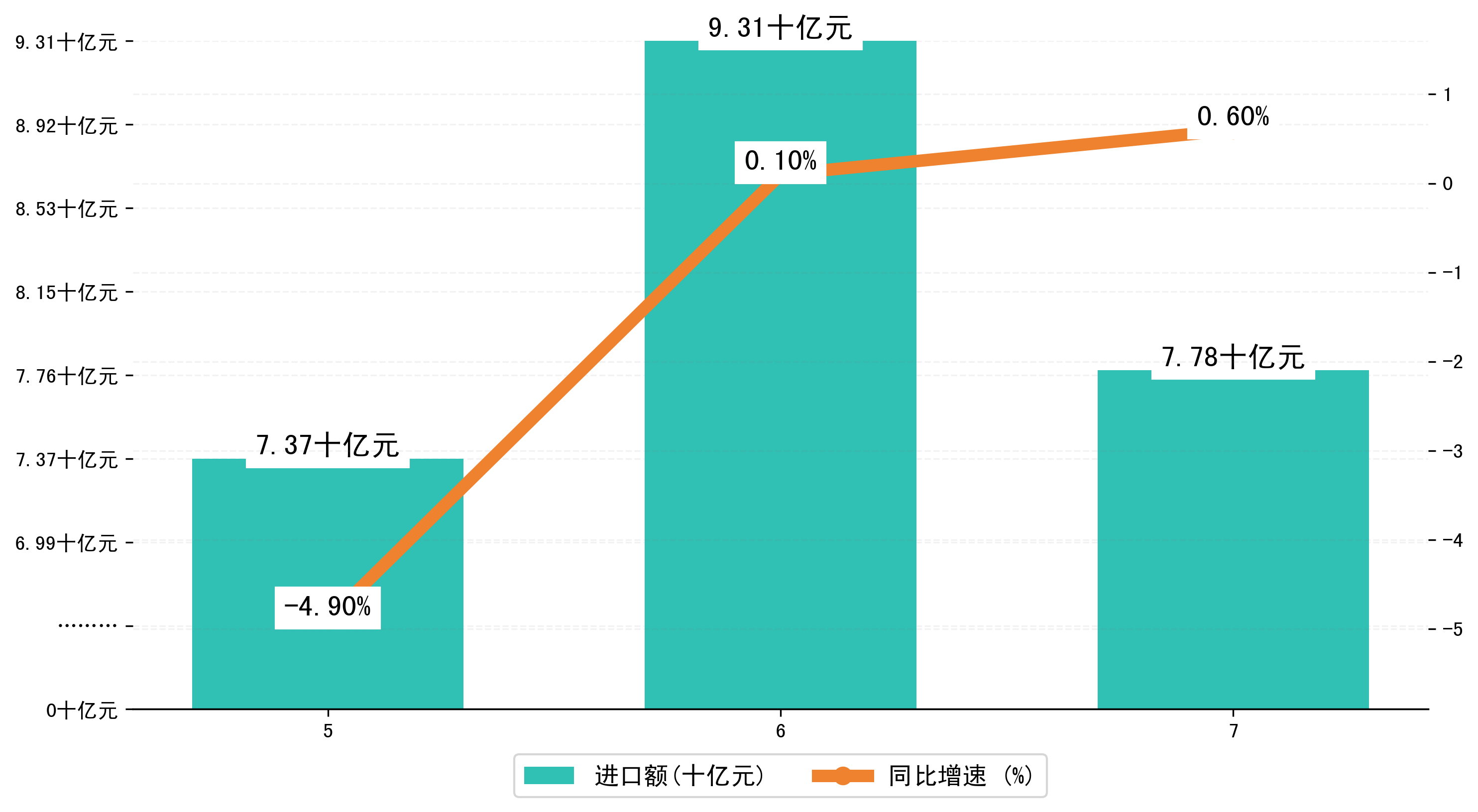 以美元计,2024年1-7月防城港市进口额为73,1947.9448万美元,相比上年同期减少了2,2421.8893万美元,同比增加-2.00%。