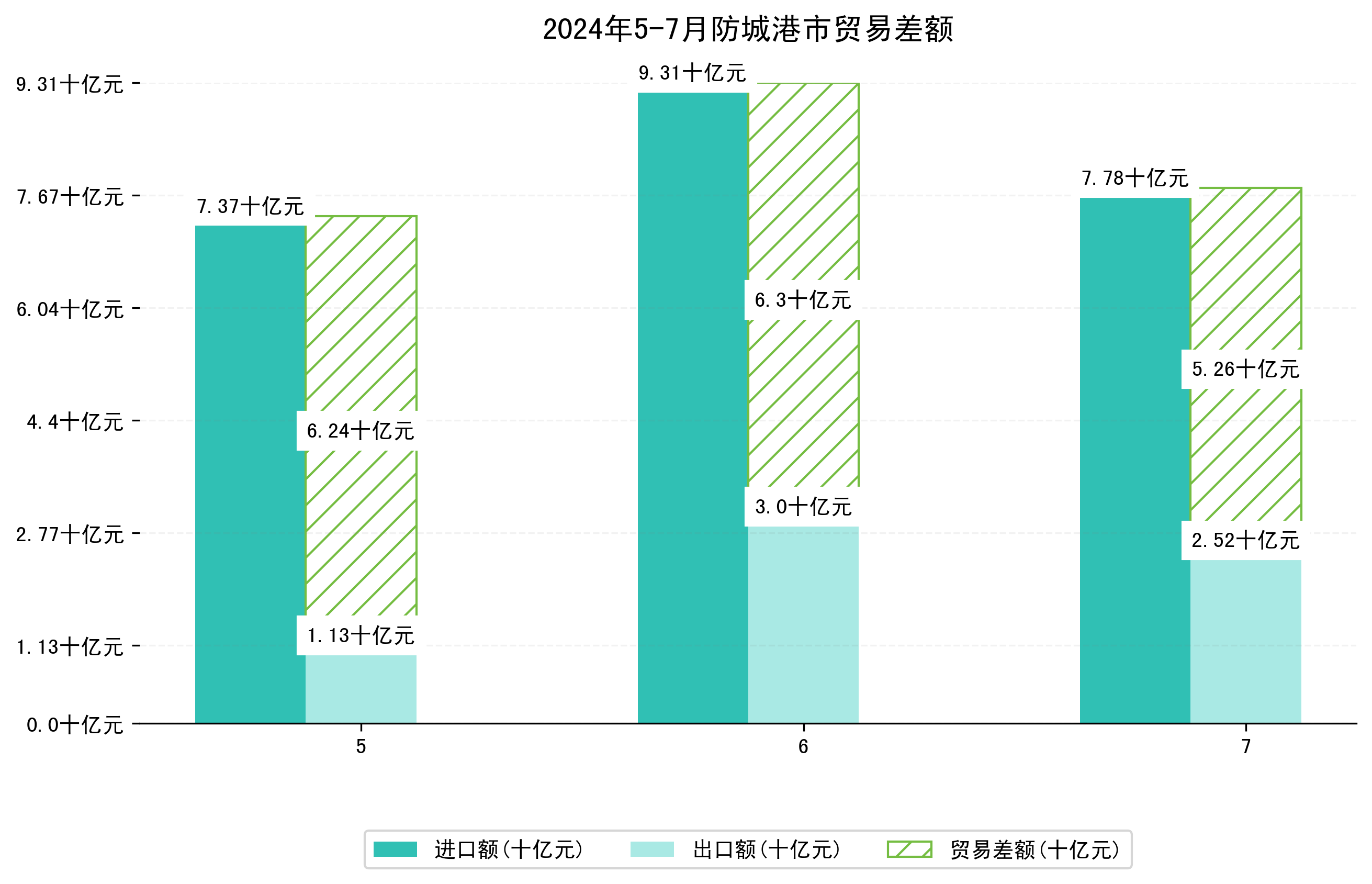 以人民币计,2024年1-7月防城港市进出口总额为622,3014.2962万元,相比上年同期增加了51,6576.7919万元,同比增加了10.10%。