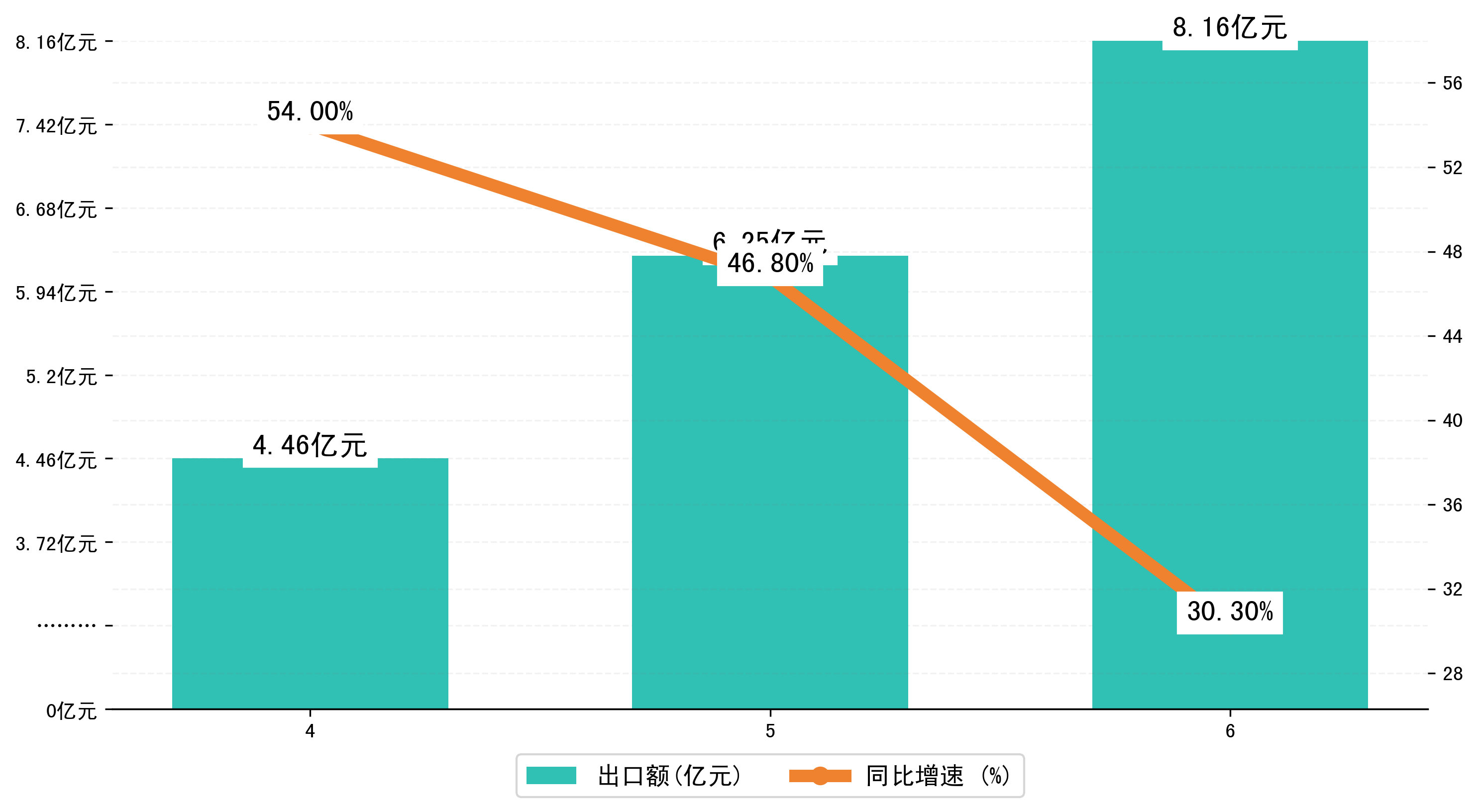 以美元计,2023年1-6月防城港市出口额为5,6542.2124万美元,相比上年同期增加了1,0358.2811万美元,同比增加22.40%。