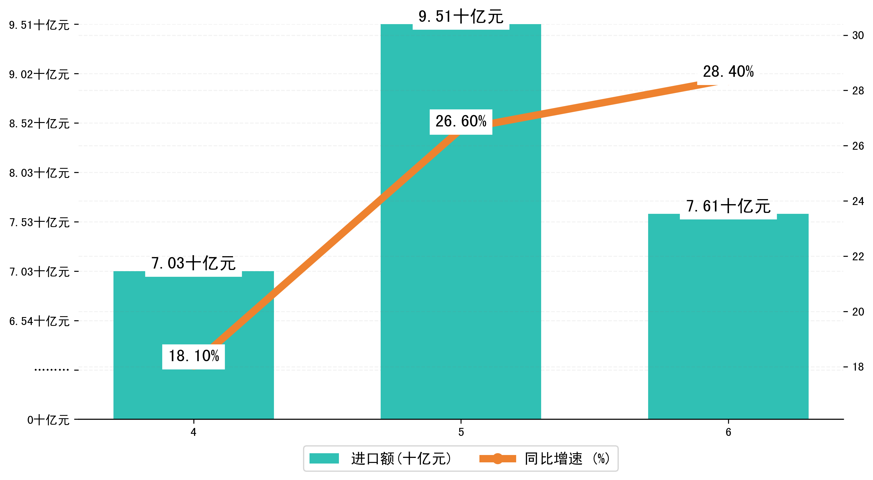 以人民币计,2023年6月防城港市进口额为76,0812.0923万元,相比上月减少了19,0570.1357万元;相比上年同期增加了17,0199.4897万元,同比增加了28.40%。