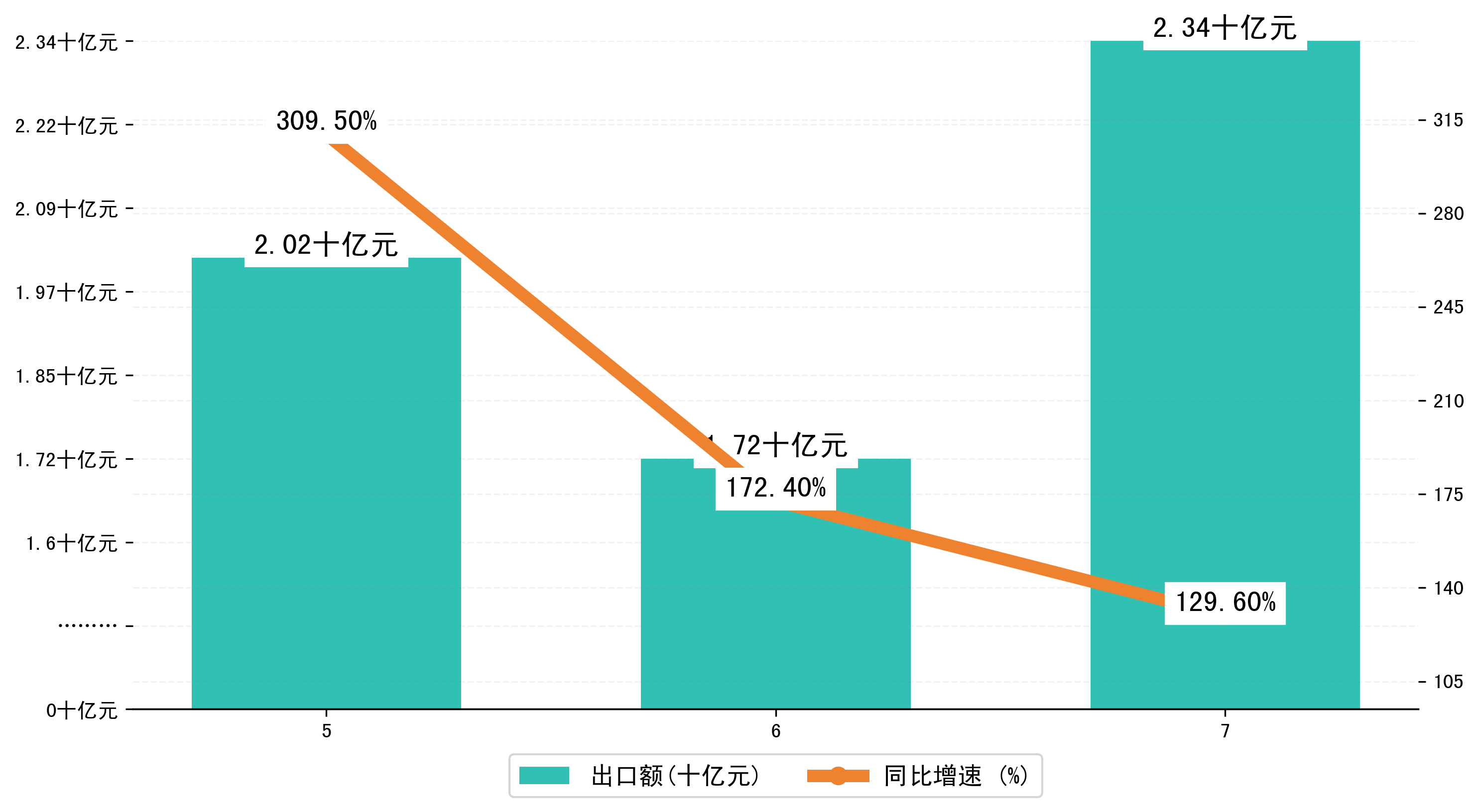 以人民币计,2025年1-7月防城港市出口额为233,6427.6204万元,相比上年同期增加了131,3049.8349万元,同比增加了129.60%。