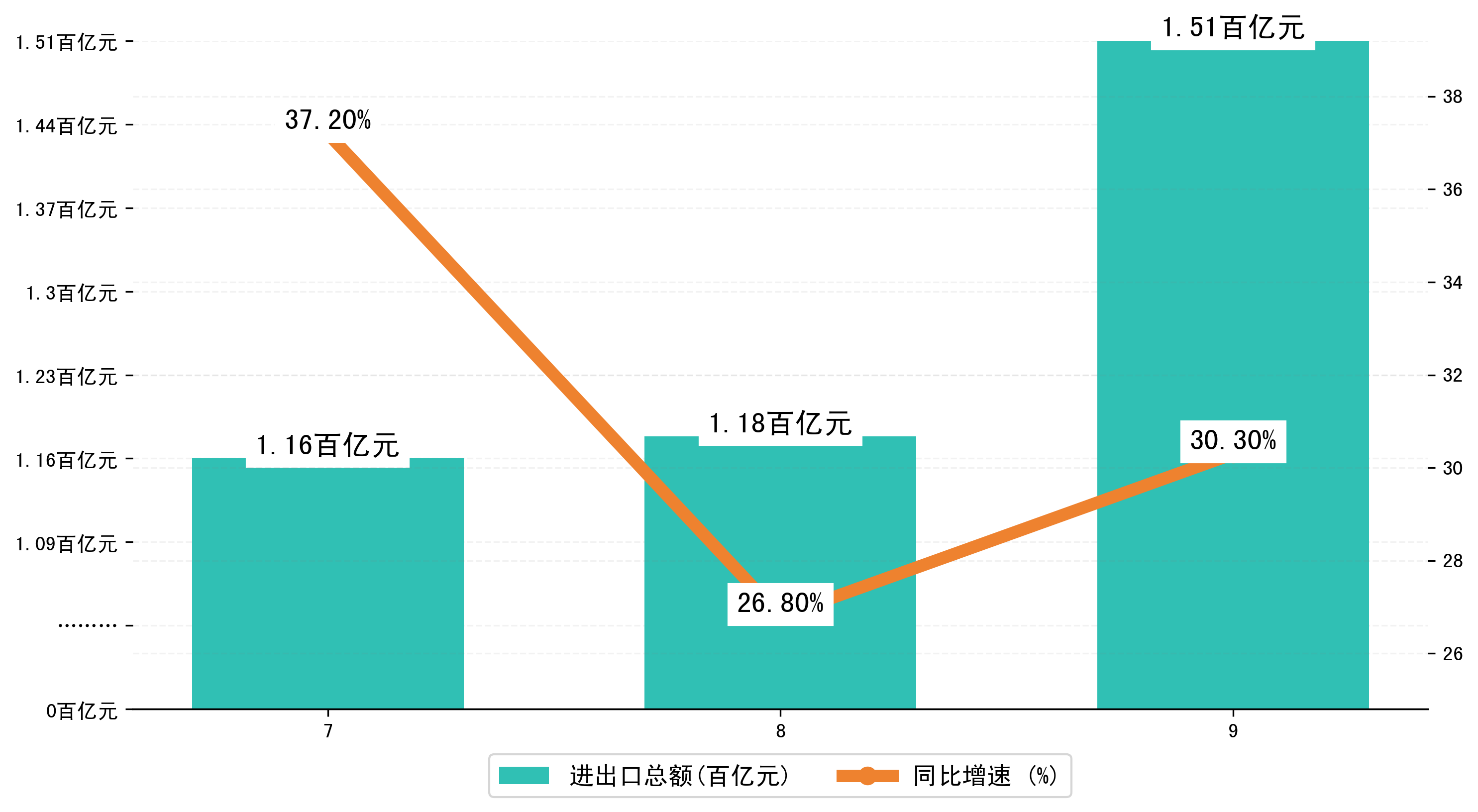 以人民币计,2025年9月防城港市进出口总额为151,0186.3703万元,相比上月增加了33,5157.2913万元;相比上年同期增加了53,6012.3313万元,同比增加了30.30%。