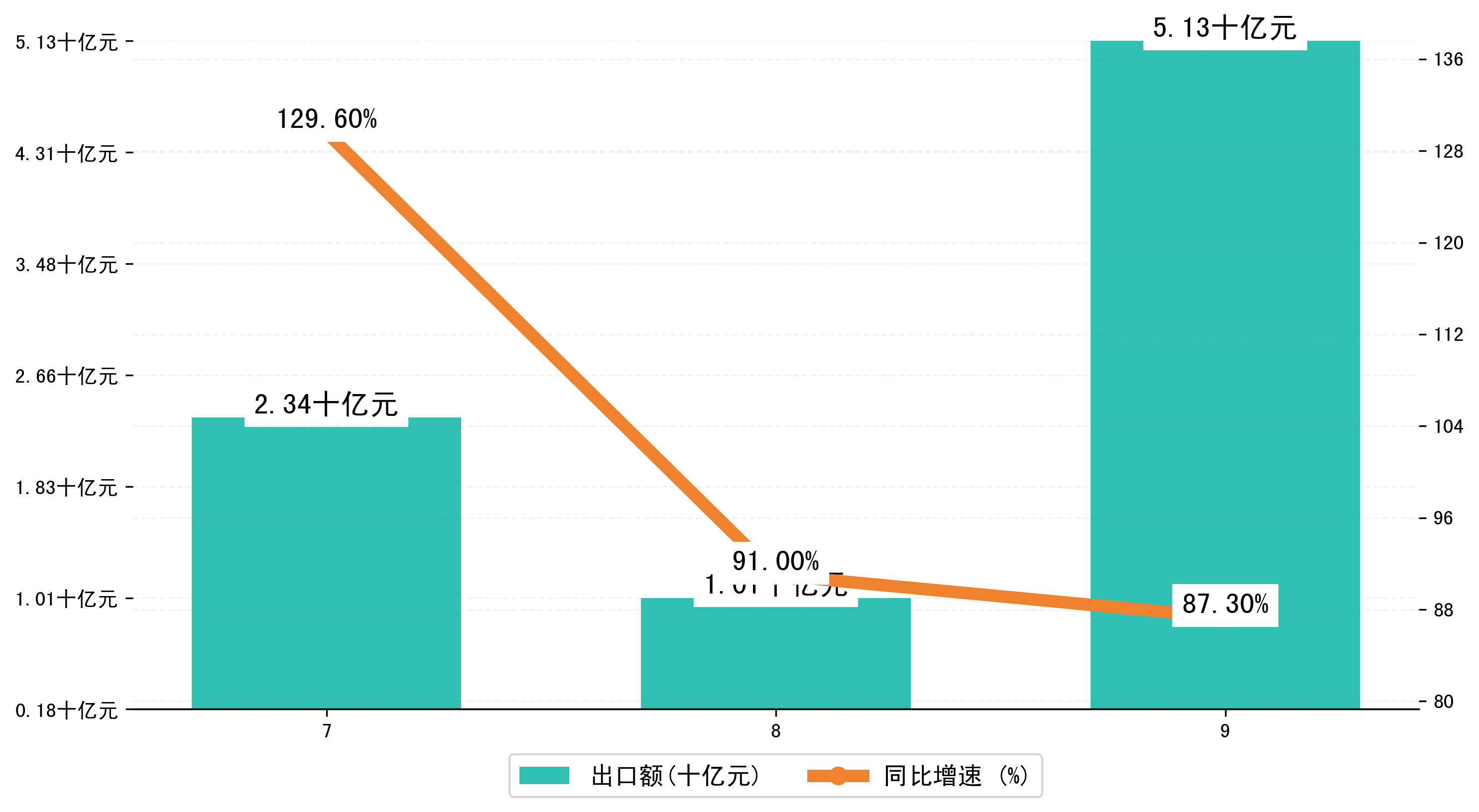 以人民币计,2025年9月防城港市出口额为51,3357.5285万元,相比上月增加了41,2586.2301万元;相比上年同期增加了21,3772.31万元,同比增加了87.30%。