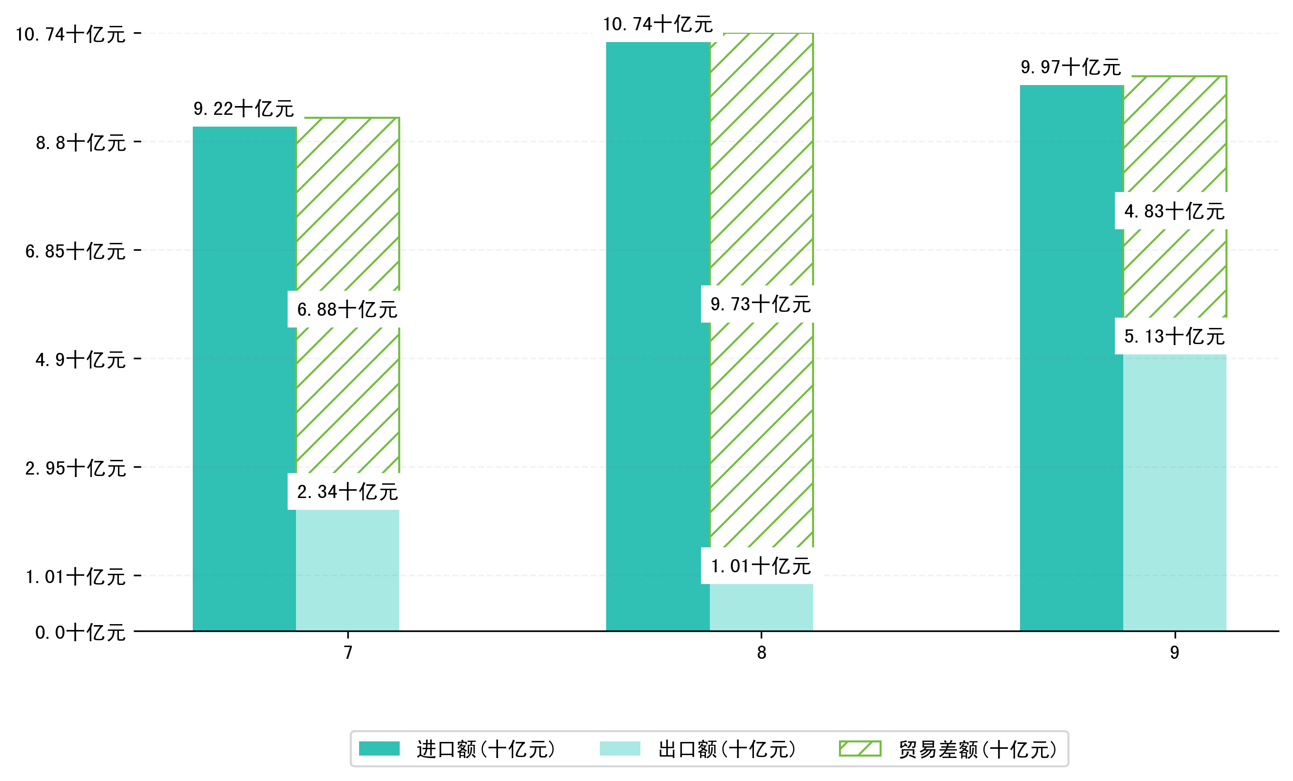 以人民币计,2025年9月防城港市贸易差额为48,3471,3134万元(贸易逆差),相比上月增加了49,0015,1688万元,即6,8347,6417万美元;相比上年同期减少了10,8467,7114万元,同比减少28.92%。