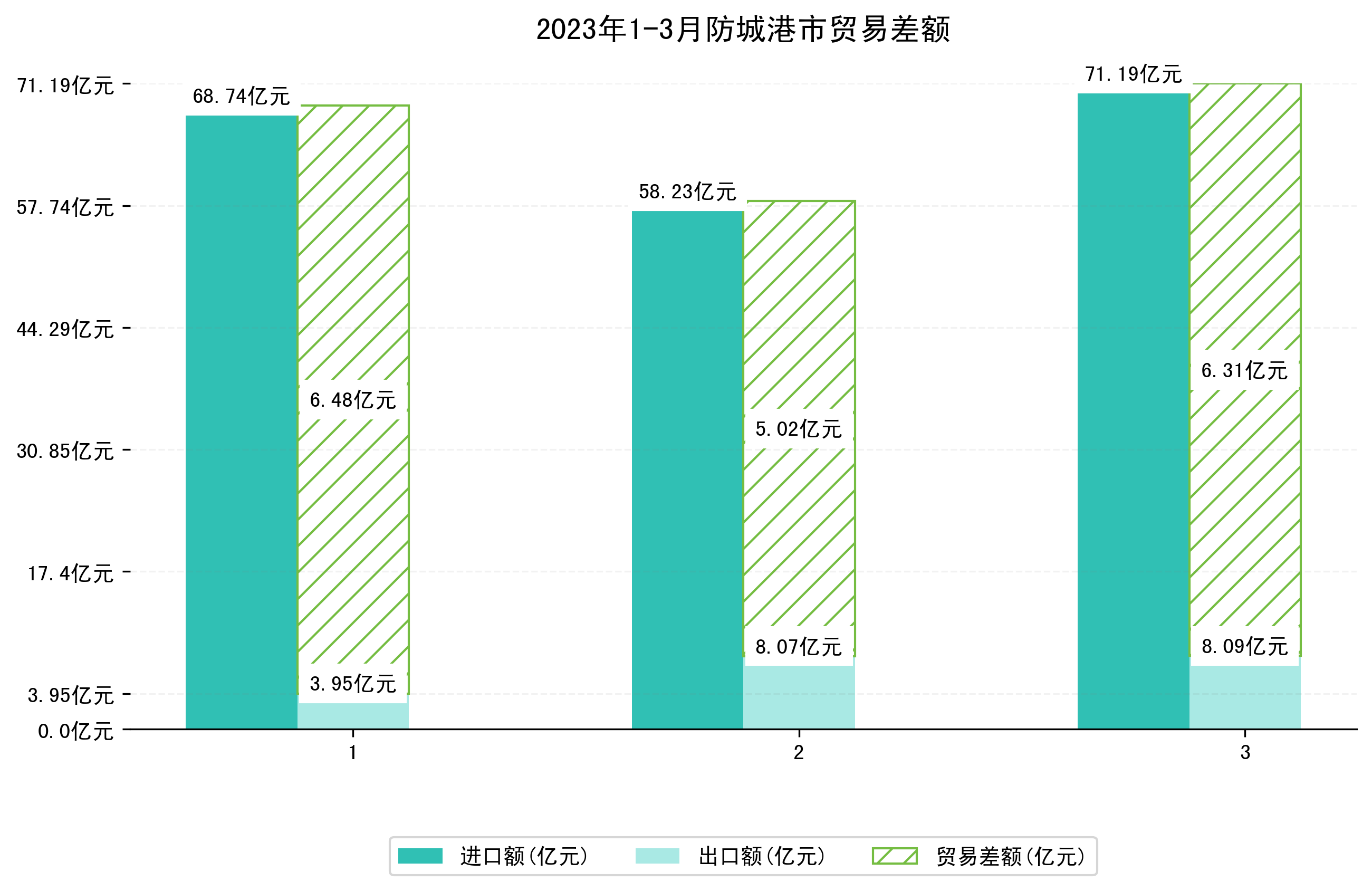以美元计,2023年1-3月防城港市贸易差额为25,9318,8196万美元(贸易逆差),相比上年同期减少了2,9136,5096万美元,同比减少12.66%。
