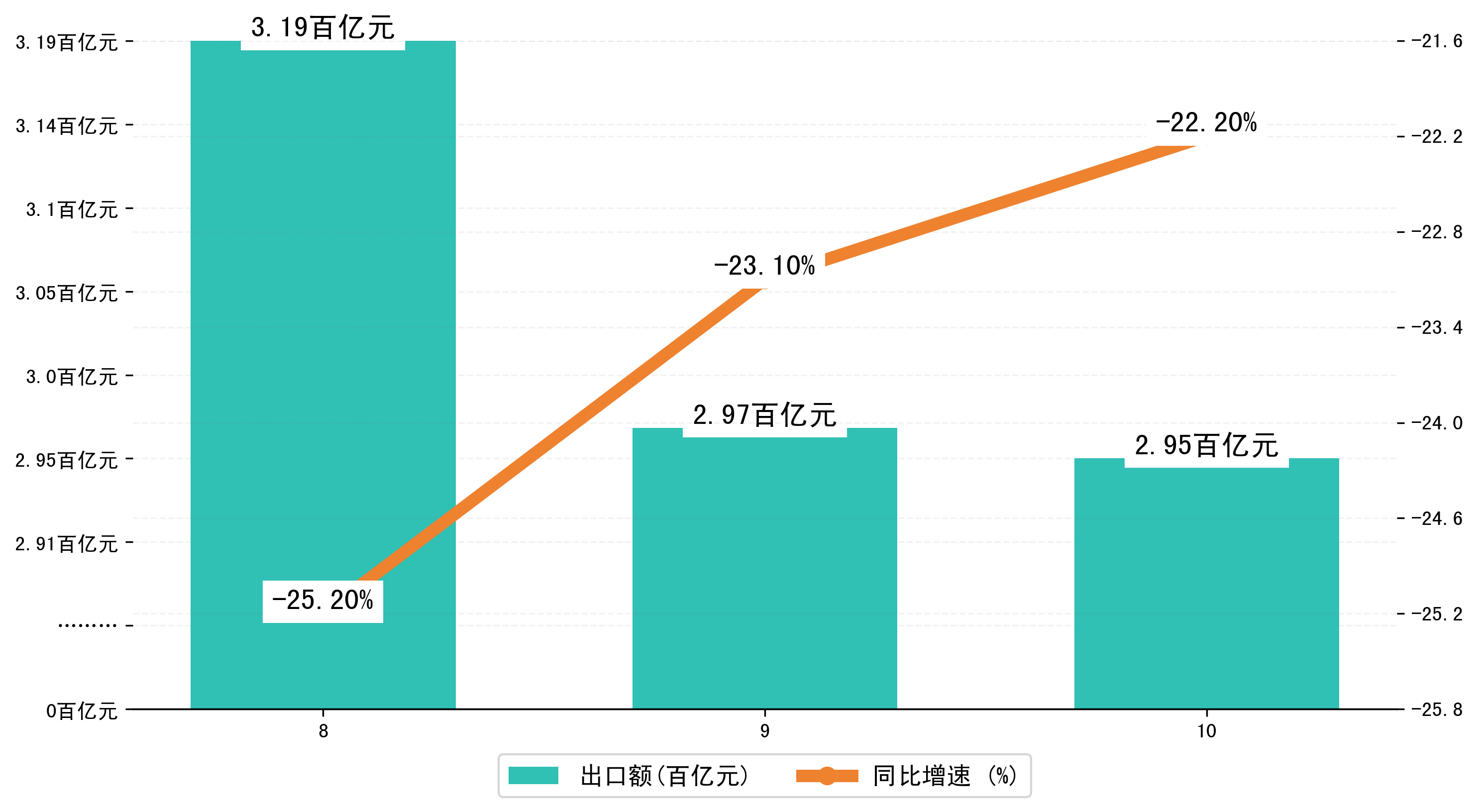 以人民币计,2024年10月佛山市出口额为295,3178.522万元,相比上月减少了1,7483.5604万元;相比上年同期减少了38,0109.33万元,同比减少了-22.20%。