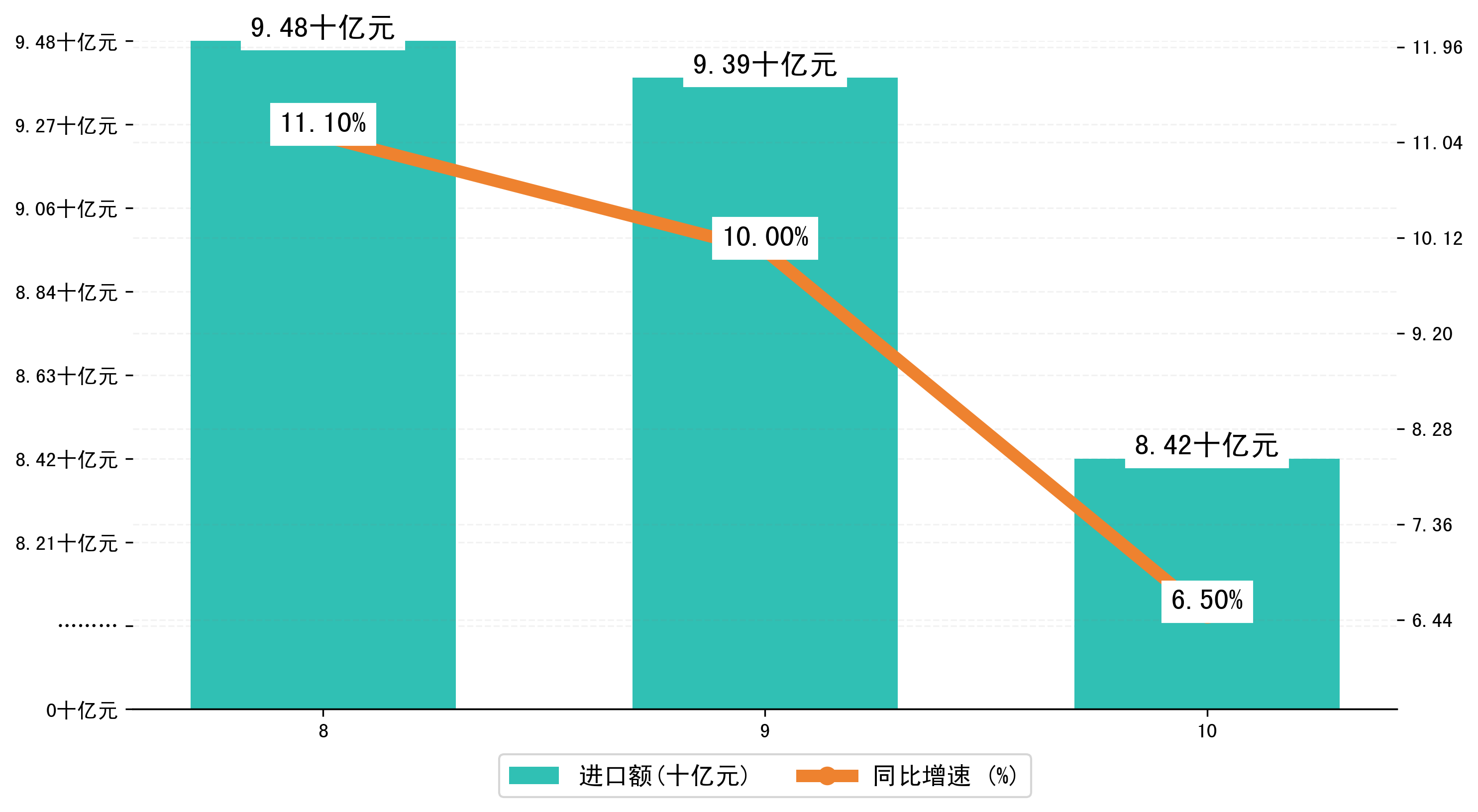以人民币计,2024年10月佛山市进口额为84,1845.3284万元,相比上月减少了9,6824.3534万元;相比上年同期减少了19,9882.9849万元,同比增加了6.50%。