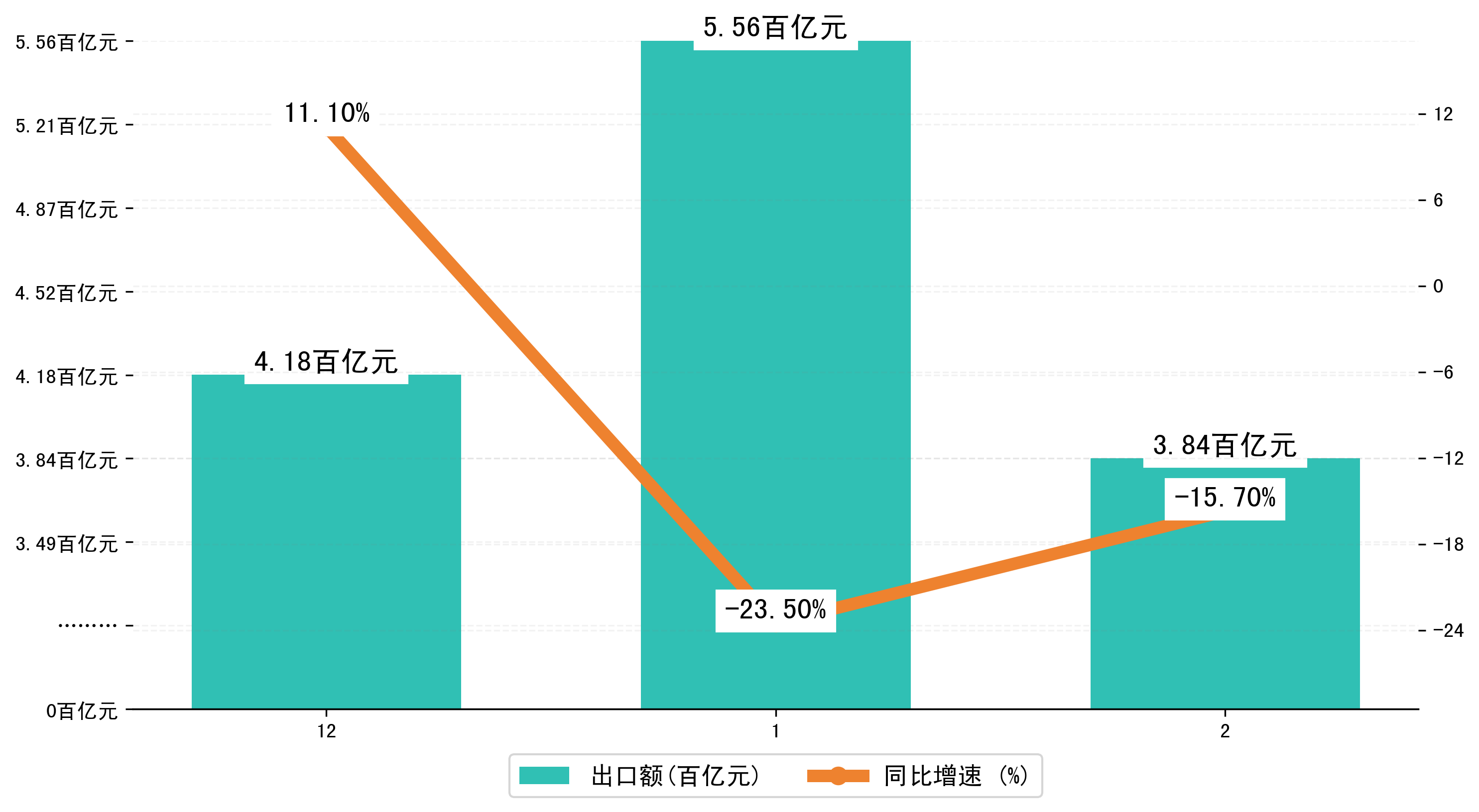 以人民币计,2023年2月佛山市出口额为383,5599.0642万元,相比上月减少了172,0640.6258万元;相比上年同期减少了4,1330.4018万元,同比减少了-15.70%。