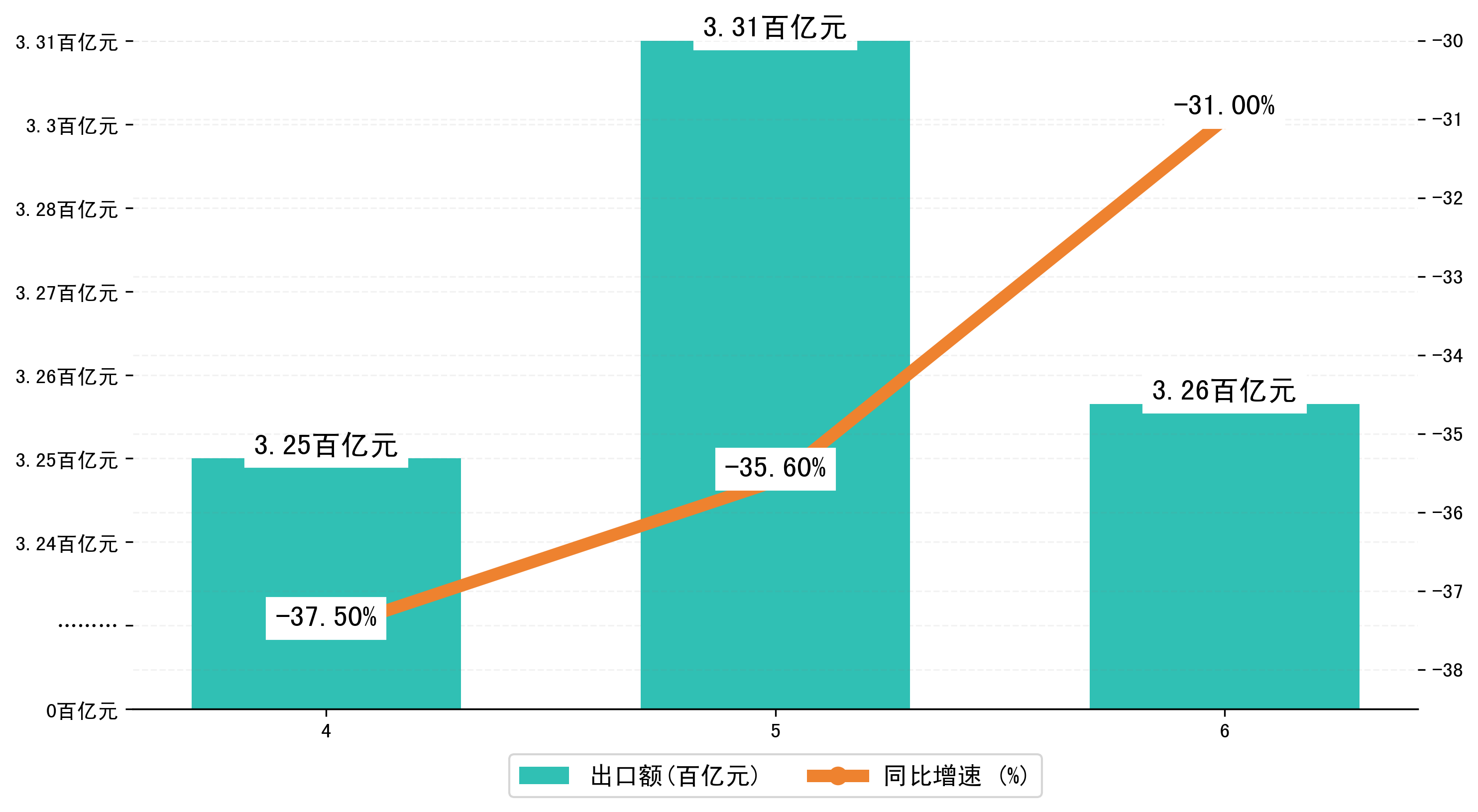 以人民币计,2024年6月佛山市出口额为325,5700.3868万元,相比上月减少了5,1679.5337万元;相比上年同期增加了24,3058.3912万元,同比减少了-31.00%。