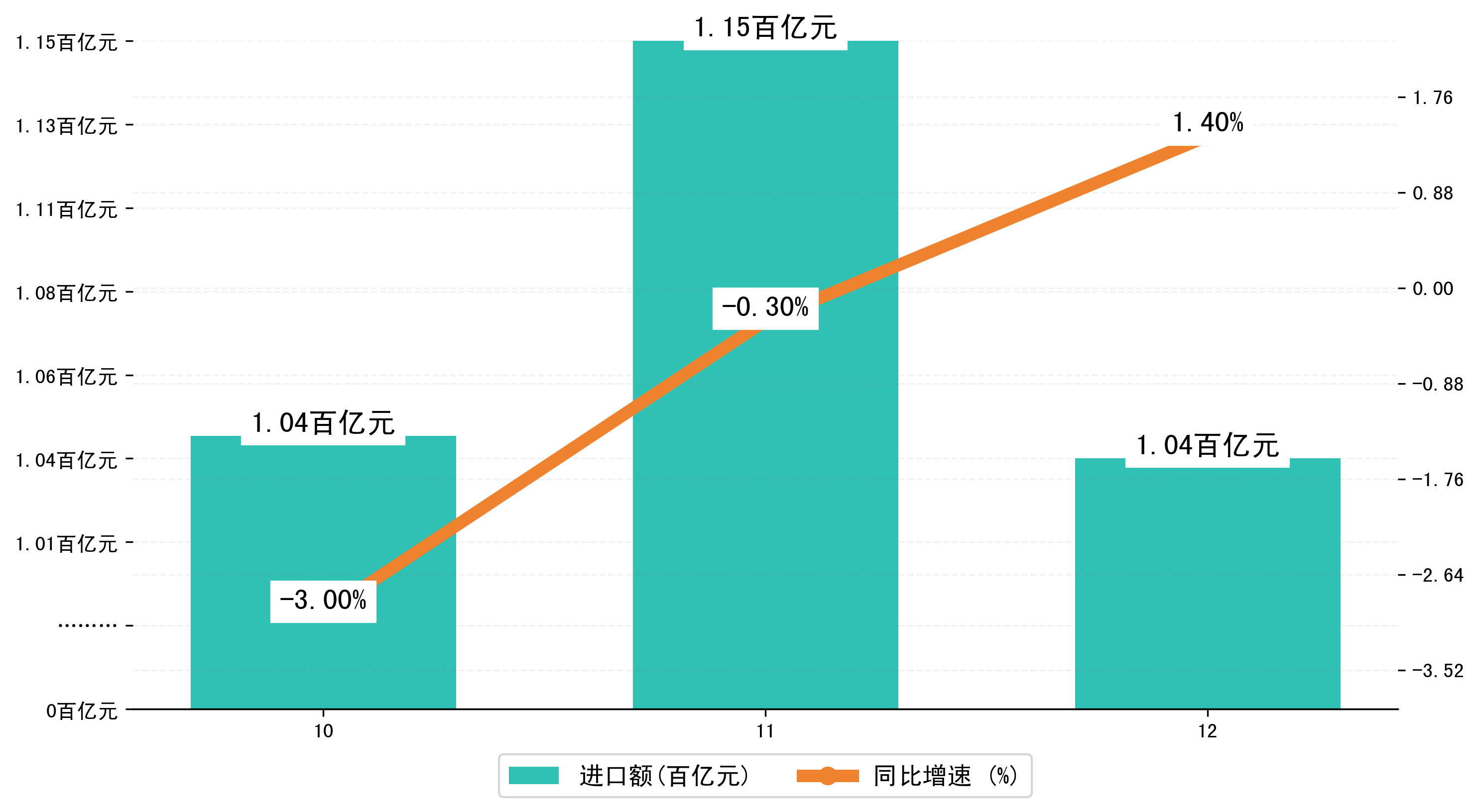 以人民币计,2023年12月佛山市进口额为103,5359.6883万元,相比上月减少了11,7562.9318万元;相比上年同期增加了17,7112.722万元,同比增加了1.40%。