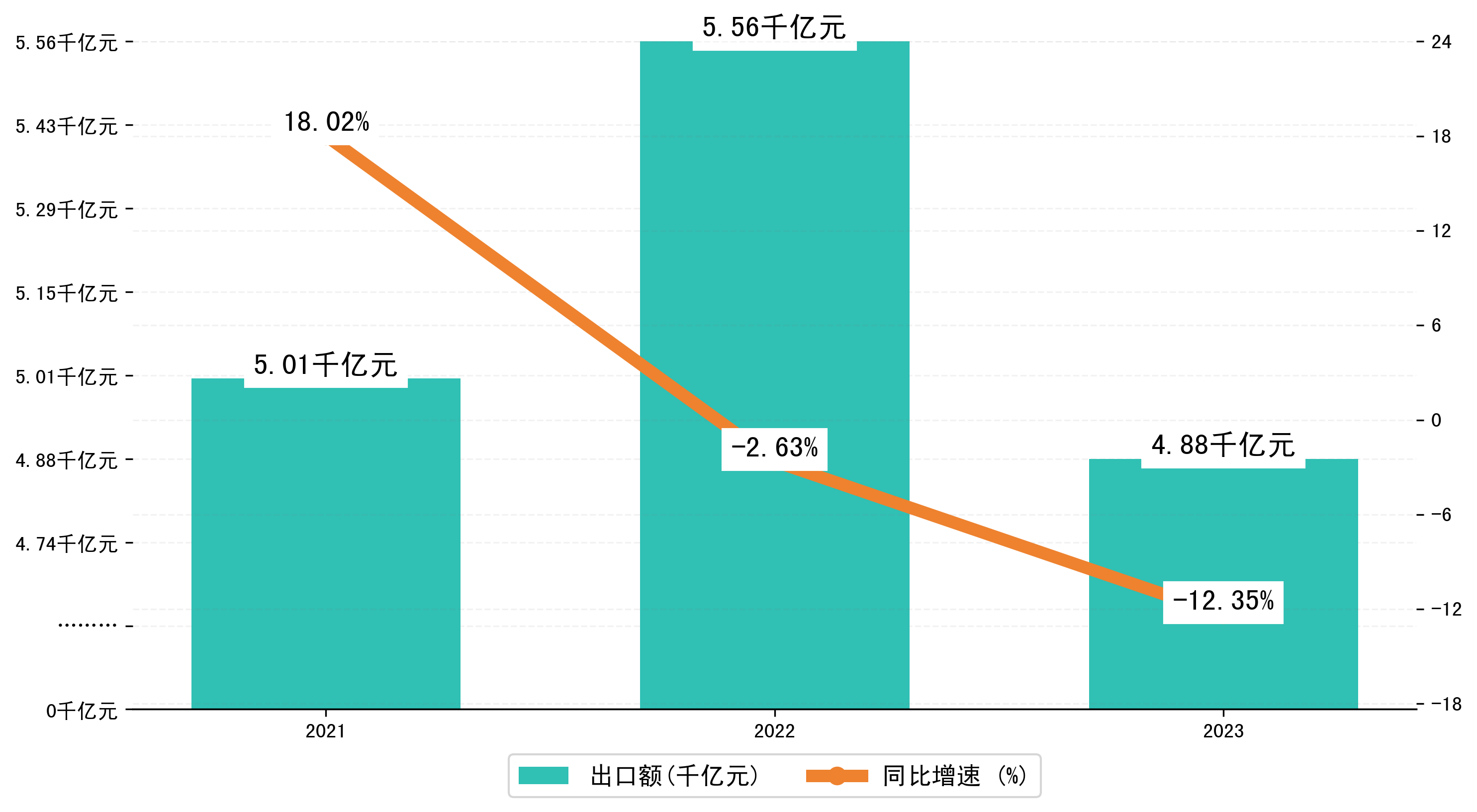 以人民币计,2023年1-12月佛山市出口额为4875,5519.6836万元,相比上年同期减少了686,9834.1918万元,同比减少了-12.80%。