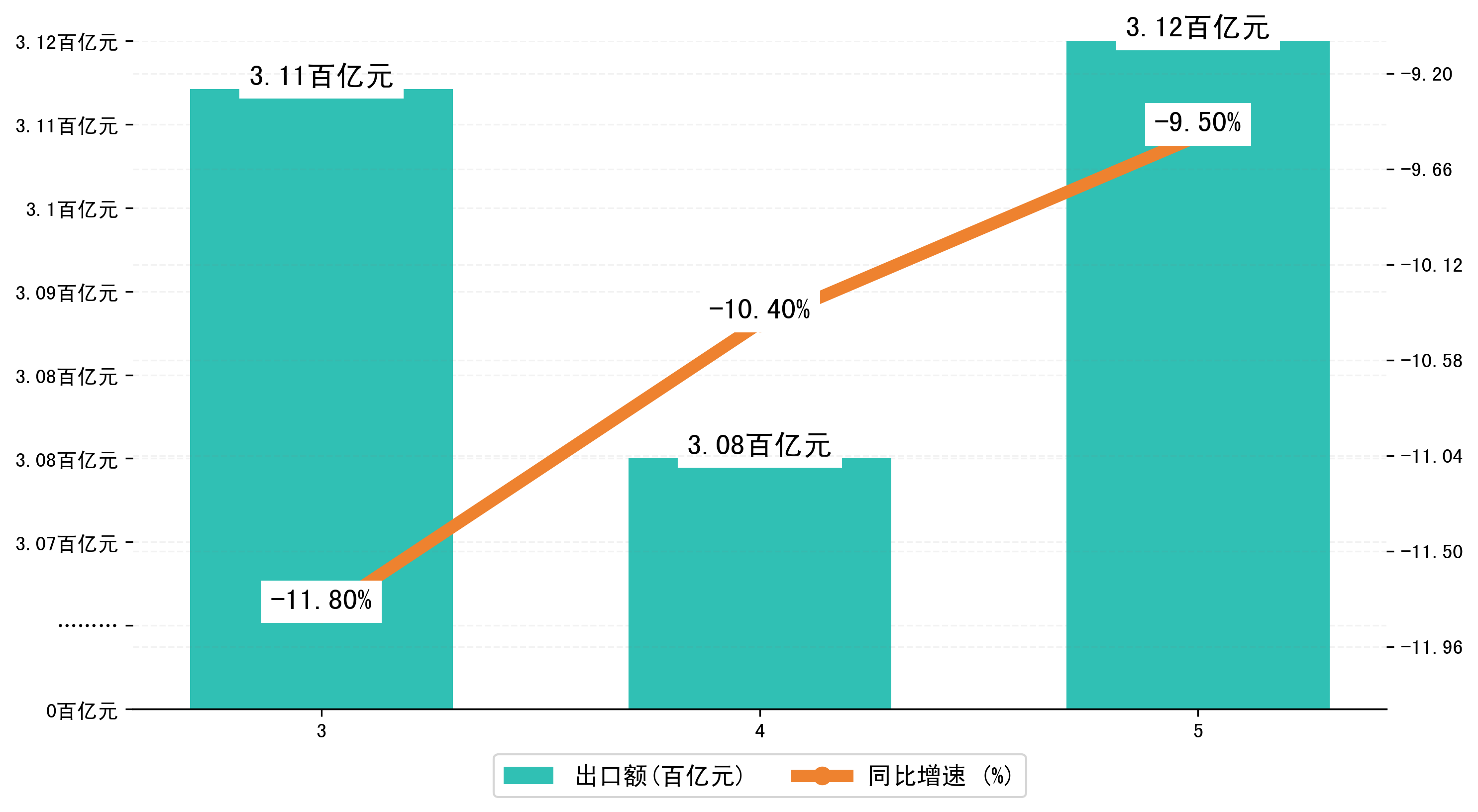 以人民币计,2025年5月佛山市出口额为311,7949.2154万元,相比上月增加了4,1546.9539万元;相比上年同期减少了18,9430.7051万元,同比减少了-9.50%。