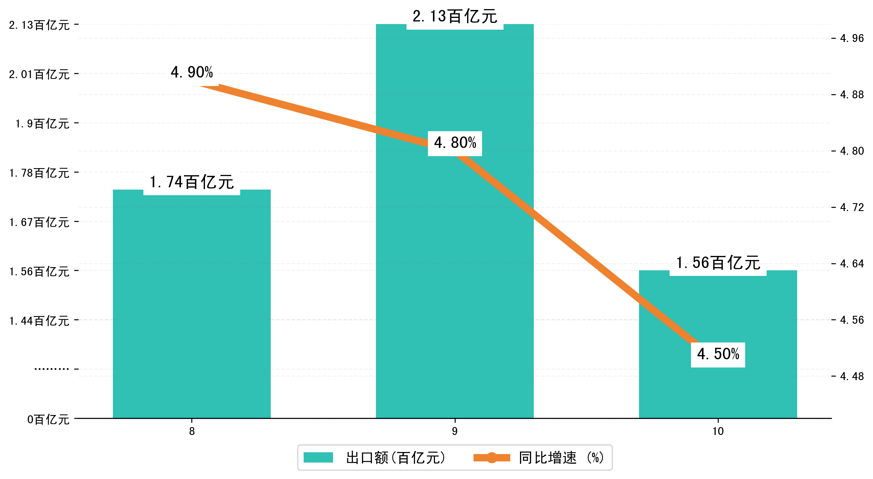 以人民币计,2024年10月福州市出口额为155,5761.6583万元,相比上月减少了56,9427.1418万元;相比上年同期增加了1,1827.2285万元,同比增加了4.50%。