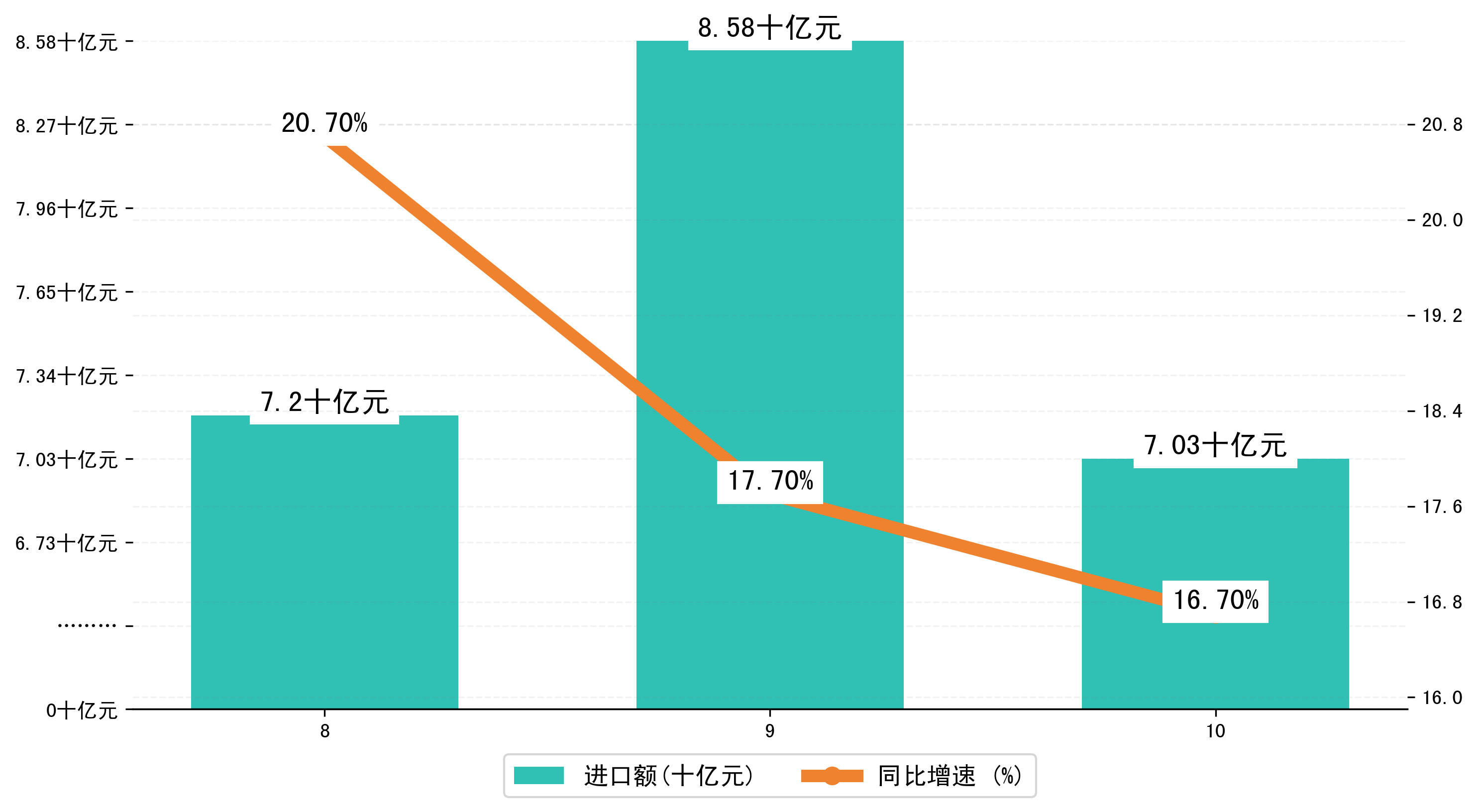以人民币计,2024年10月福州市进口额为70,3477.0891万元,相比上月减少了15,4621.8537万元;相比上年同期增加了5,5535.5895万元,同比增加了16.70%。