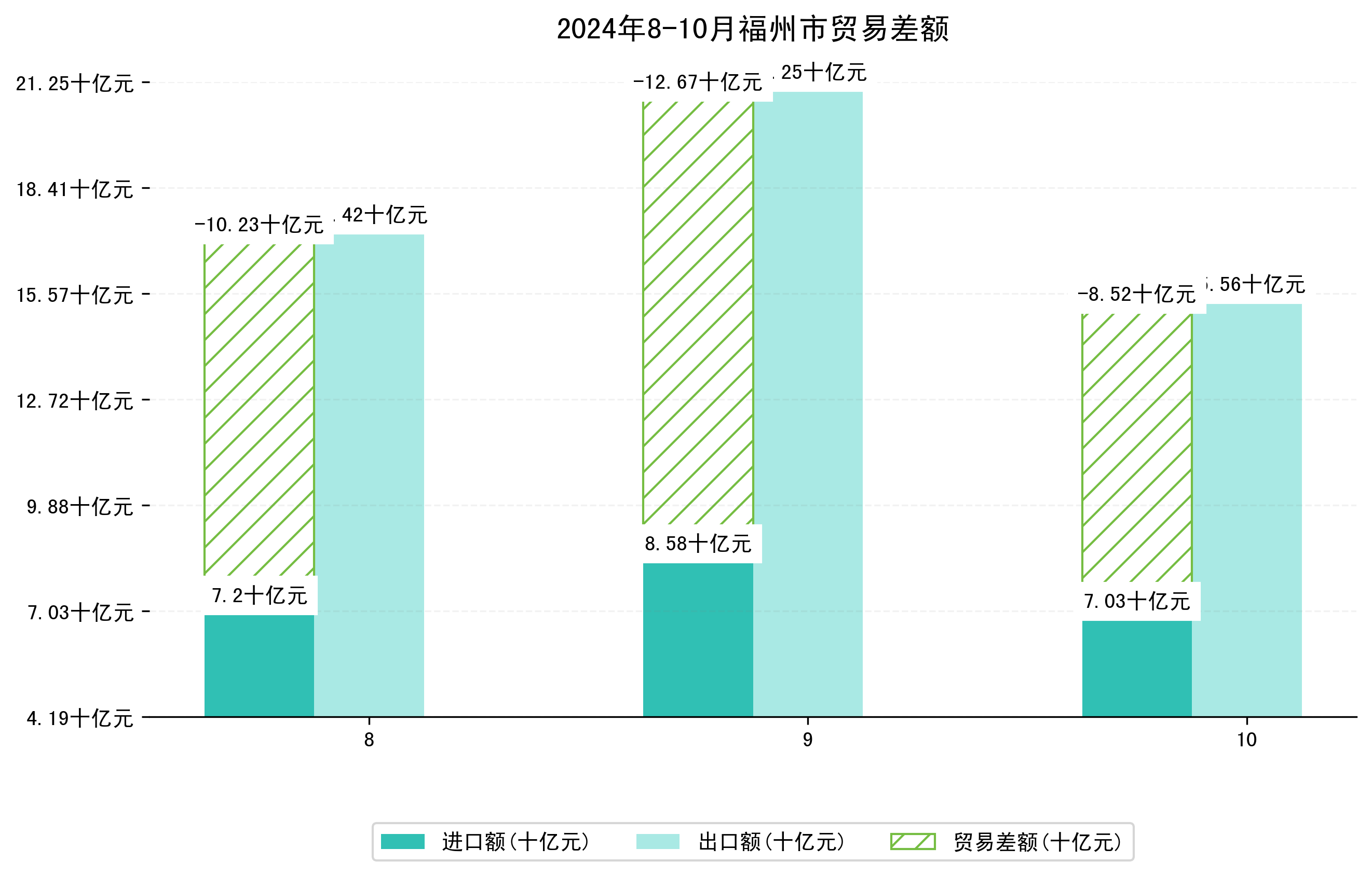 以人民币计,2024年10月福州市贸易差额为85,2284,5692万元(贸易顺差),相比上月减少了41,4805,2881万元,即5,7788,9787万美元;相比上年同期减少了4,3708,3610万元,同比减少-4.88%。